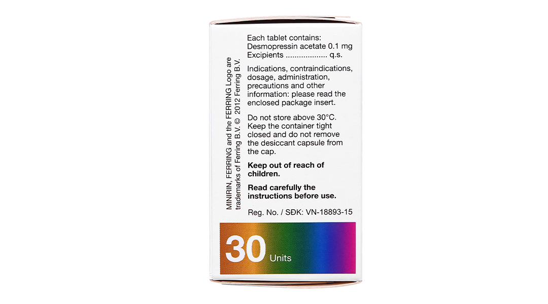 - Minirin 0.1mg: Mỗi viên nén chứa desmopressin acetate 0,1 mg tương đương với desmopressin (dạng base tự do) 0,089 mg.
