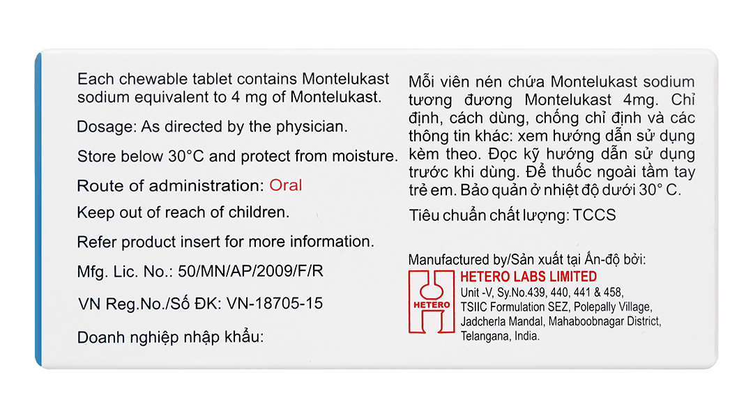 - Thành phần dược chất: Montelukast natri tương đương montelukast 4mg.