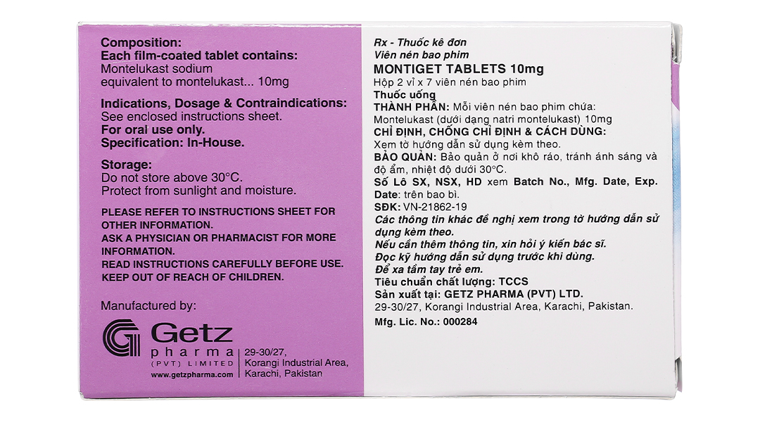- MONTIGET TABLETS 10mg (Montelukast) cũng được chỉ định ở người trưởng thành để làm giảm các triệu chứng viêm mũi dị ứng theo mùa.