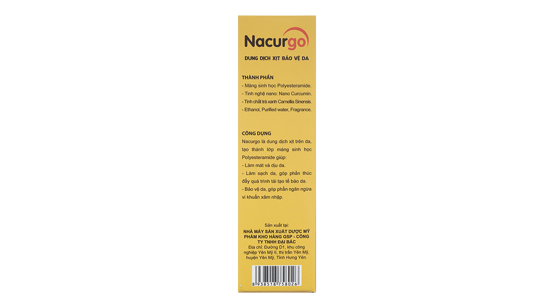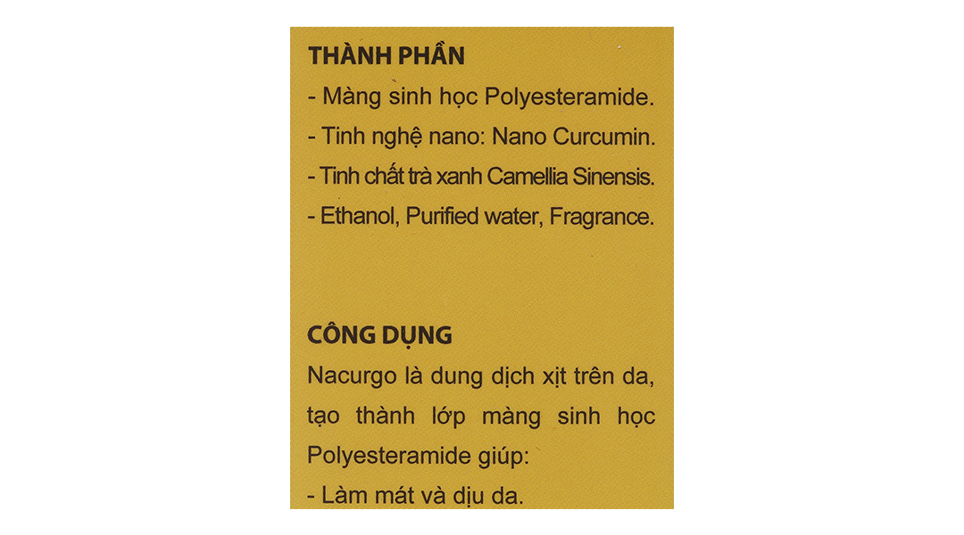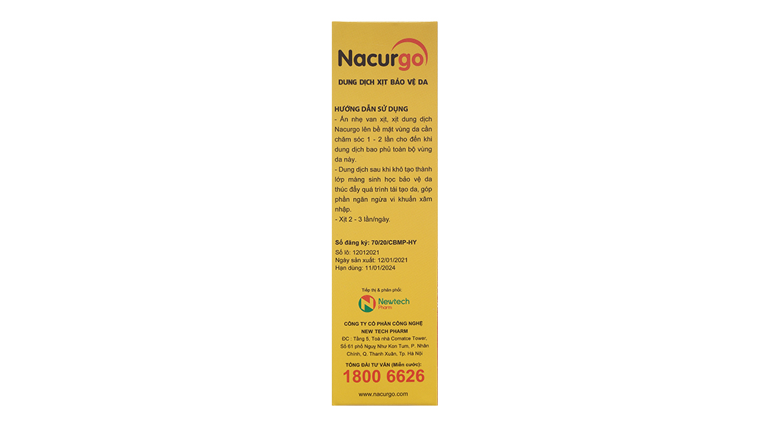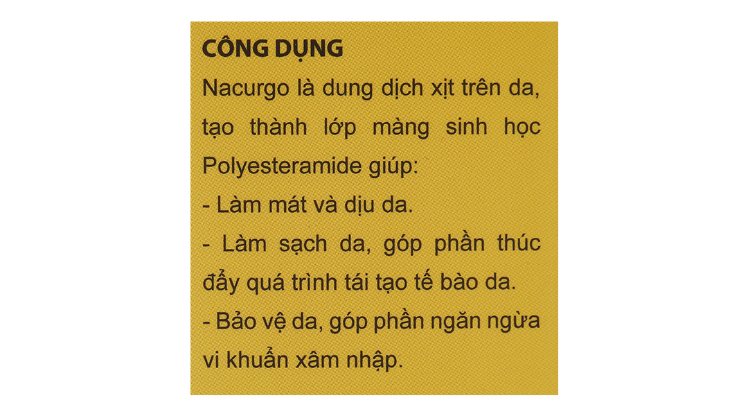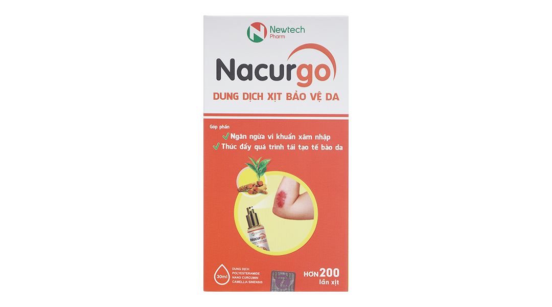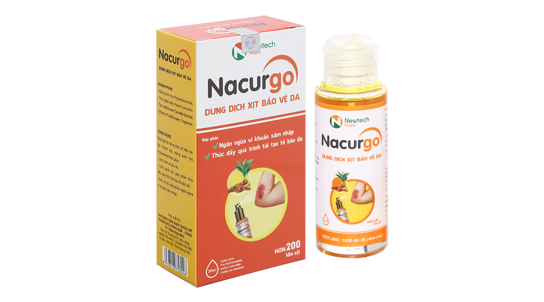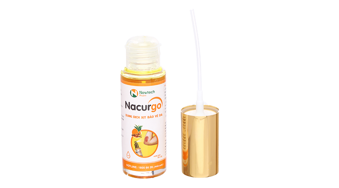 Chai xịt Nacurgo là dạng dung dịch sát trùng giúp bảo vệ, tái tạo da, ngừa vi khuẩn.