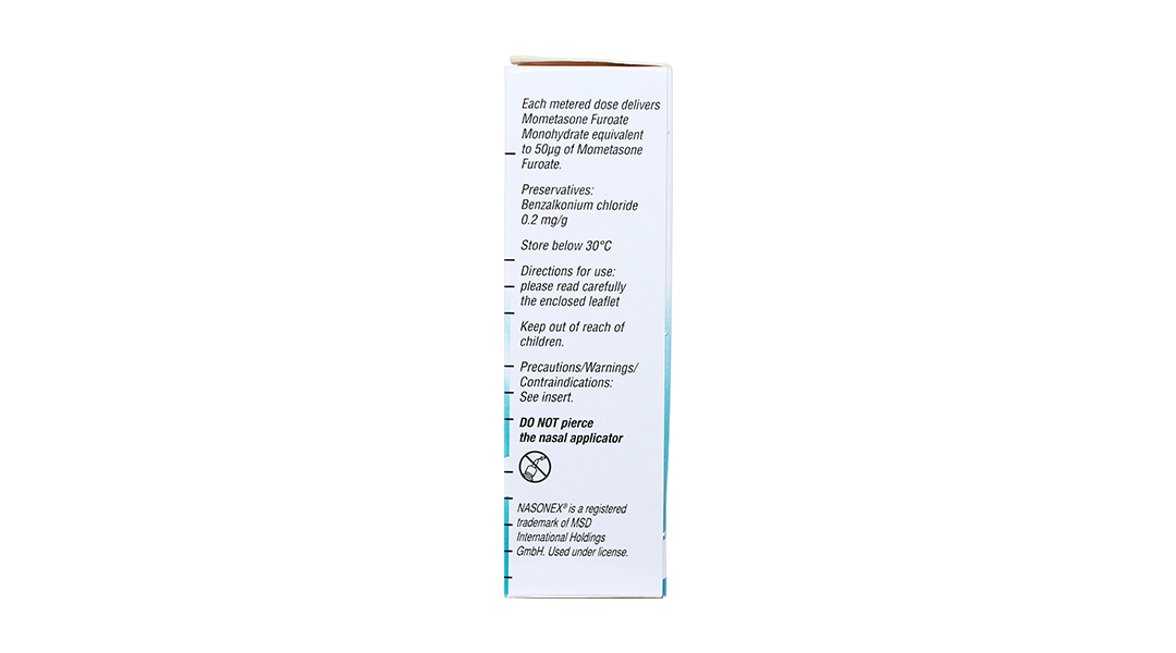 - Mô tả: Nasonex Aqueous Nasal Spray là bình xịt định liều chứa hỗn dịch mometason furoat. Mỗi nhát xịt bơm định liều Nasonex Aqueous Nasal spray giải phóng khoảng 100mg hỗn dịch mometason furoat, chứa mometason furoat monohydrat tương đương 50mcg mometason furoat.