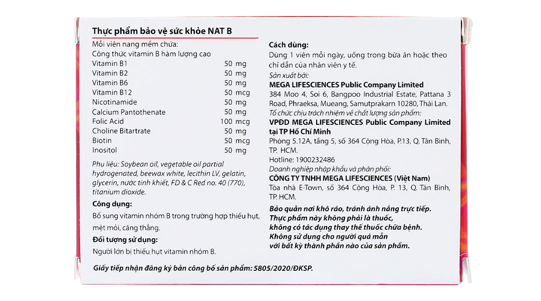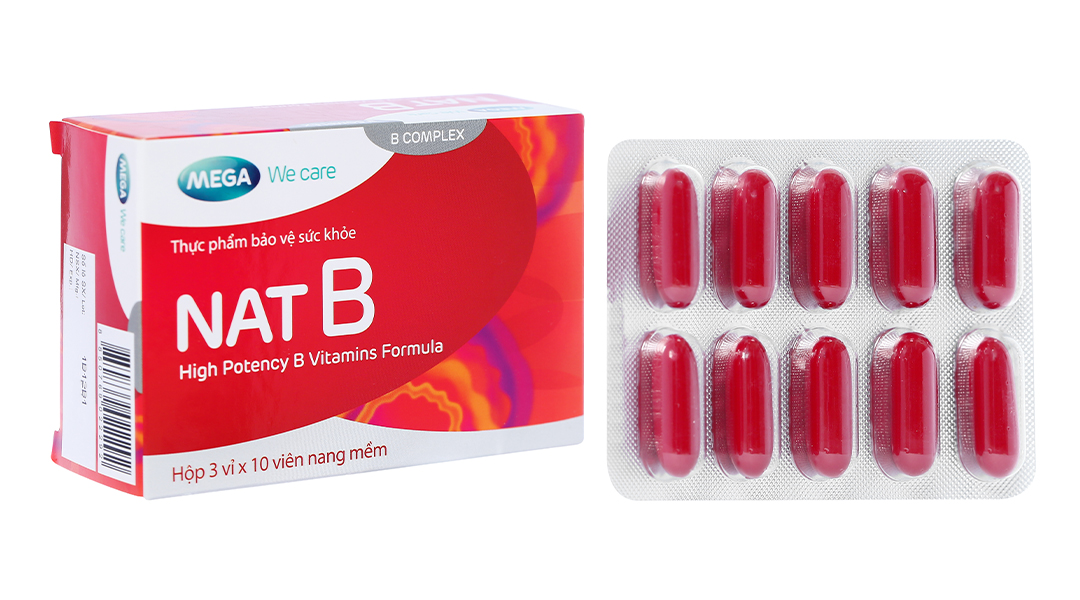 - Nat B là sản phẩm bổ sung vitamin B tổng hợp giúp đáp ứng nhu cầu bổ sung các vitamin B thiết yếu cho cơ thể. Mỗi viên nang mềm Nat B chứa một sự kết hợp của các vitamin B quan trọng như Vitamin B1, Vitamin B2, Vitamin B6, Vitamin B12, Niacinamide (Vitamin B3), Acid Folic (Vitamin B9), Biotin (Vitamin H), Inositol (Vitamin B8) và Choline Bitartrate. Các thành phần này đóng vai trò then chốt trong việc duy trì năng lượng, cải thiện chức năng thần kinh, hỗ trợ sức khỏe tim mạch và cân bằng cảm xúc.