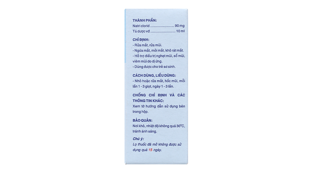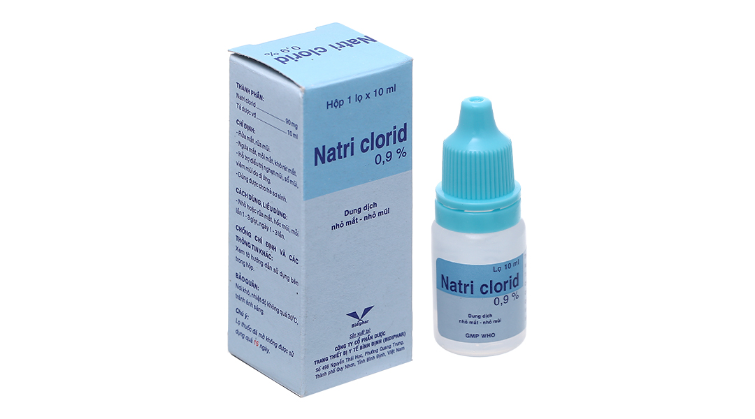 Natri clorid 0,9% là dung dịch đẳng trương làm mát dịu niêm mạc mắt và mũi, giúp loại trừ các bụi bẩn, hóa chất và duy trì độ ẩm cần thiết cho mắt.