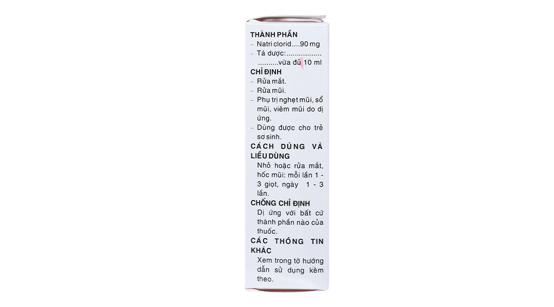 Natri clorid 0,9% là dung dịch đẳng trương được dùng rửa mắt và được dùng nhỏ mũi để giảm những triệu chứng như nghẹt mũi, chảy mũi, viêm mũi do dị ứng.