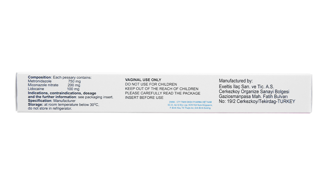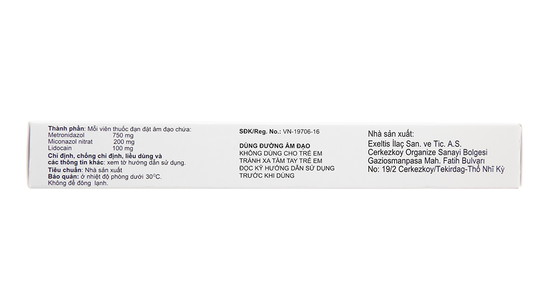Metronidazol 750 mg, Miconazol nitrat 200 mg, Lidocain 100 mg (43 mg Lidocain base + 70,25 mg Lidocain HCI)
