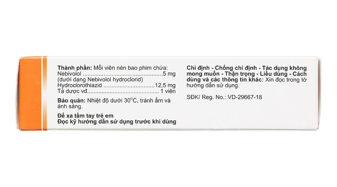 Chuyển hóa/nội tiết Nebivolol không tác động đến mức Glucose ở bệnh nhân tiểu đường. Tuy nhiên, phải thận trọng đối với bệnh nhân tiểu đường, vì Nebivolol có thể che lấp một số triệu chứng hạ đường huyết (nhịp tim nhanh, đánh trống ngực). Các chất chẹn beta-adrenergic có thể che lấp các triệu chứng nhịp tim nhanh ở những bệnh nhân bị cường giáp. Ngừng thuốc đột ngột có thể làm trầm trọng thêm các triệu chứng. Khác Thuốc này có chứa lactose. Bệnh nhân mắc các rối loạn chuyển hóa di truyền hiếm gặp về dung nạp galactose, chứng thiếu hụt lactase Lapp hoặc rối loạn hấp thu Glucose-galactose không nên sử dụng thuốc này. Cần thận trọng khi điều trị bệnh nhân có tiền sử bệnh vẩy nến với các thuốc ức chế beta vì các thuốc này có thể gây tăng nhạy cảm với các dị nguyên và làm trầm trọng thêm các phản ứng quá mẫn. Cần phải kiểm soát đều đặn khi khởi đầu điều trị bệnh suy tim mạn tính với Nebivolol. Không được đột ngột ngưng điều trị trừ khi có chỉ định rõ ràng. Liên quan đến Hydrochlorothiazide Suy thận Lợi ích toàn bộ từ việc điều trị với thuốc lợi tiểu Thiazid chỉ có thể đạt được nếu chức năng thận không bị thay đổi. Ở bệnh nhân bị suy thận, thuốc lợi tiểu Thiazid có thể làm tăng nitơ máu. Các tác động tích lũy của chất tính này có thể xảy ra ở bệnh nhân suy giảm chức năng thận. Nếu sự suy thận tiến triển rõ ràng, chẳng hạn được biểu hiện bởi sự gia tăng nitơ không phải từ Protein, cần phải cẩn thận đánh giá lại việc điều trị, và xem xét việc ngưng dùng thuốc lợi tiểu. Các tác động lên chuyển hóa và nội tiết Điều trị với các dẫn chất Thiazid có thể thay đổi dung nạp Glucose. Có thể cần phải điều chỉnh liều lượng insulin hoặc các thuốc uống hạ đường huyết. Bệnh tiểu đường tiềm ẩn có thể xuất hiện trong liệu pháp Thiazid. Điều trị với thuốc lợi tiểu Thiazid có thể liên quan đến tăng nồng độ Cholesterol và Triglycerid. Ở một số bệnh nhân, liệu pháp Thiazid có thể làm giảm bài tiết Acid Uric qua ống thận, tăng Acid Uric máu và / hoặc cơn gout. Sự mất cân bằng điện giải Giống như tất cả bệnh nhân được điều trị bằng thuốc lợi tiểu, kiểm tra chất điện giải trong huyết thanh nên được thực hiện định kỳ đều đặn. Các dẫn xuất Thiazid, bao gồm Hydrochlorothiazide, có thể gây mất cân bằng chất dịch-điện giải (đặc biệt hạ Kali máu, hạ Natri máu và nhiễm kiềm chuyển hóa do giảm Clo máu). Dấu hiệu cảnh báo sự mất cân bằng chất dịch – điện giải là khô miệng, khát nước, suy nhược, ngủ lịm, ngủ gà, bồn chồn, đau cơ, chuột rút, mỏi cơ, hạ huyết áp, tiểu ít, nhịp tim nhanh và rối loạn tiêu hóa như buồn nôn hoặc nôn. Nguy cơ hạ Kali máu tăng lên ở những bệnh nhân bị xơ gan, ở bệnh nhân bài niệu nhanh, ở những bệnh nhân đang nhận không đủ khẩu phần chất điện giải và ở bệnh nhân điều trị đồng thời với Corticosteroid hoặc ACTH. Bệnh nhân bị hội chứng QT dài, bẩm sinh hoặc do thuốc, đặc biệt có nguy cơ cao trong trường hợp hạ Kali máu. Hạ Kali máu làm tăng độc tính lên tim của các Glycosid Digitalis và nguy cơ loạn nhịp tim. Theo dõi Kali máu thường xuyên hơn được chỉ định đối với bệnh nhân có nguy cơ hạ Kali máu, khởi đầu trong vòng một tuần sau khi bắt đầu điều trị. Hạ Natri máu pha loãng có thể xảy ra ở những bệnh nhân bị phù trong thời tiết nóng. Giảm Natri huyết thanh nói chung thường nhẹ và không cần điều trị. Thiazid có thể làm giảm bài tiết Calci niệu và làm tăng Calci huyết thanh tạm thời và nhẹ không có rối loạn được biết đối với biến dưỡng Calci. Tăng Calci máu rõ rệt có thể là dấu hiệu của tăng năng tuyến cận giáp ẩn. Phải ngừng dùng thuốc Thiazid trước khi tiến hành các xét nghiệm chức năng tuyến cận giáp. Thuốc lợi tiểu Thiazid có thể làm tăng bài tiết Magnesi trong nước tiểu có thể dẫn đến giảm Magnesi trong máu. Lupus ban đỏ Đã có báo cáo về việc điều trị với thuốc lợi tiểu Thiazid làm tăng hoặc kích hoạt bệnh lupus ban đỏ hệ thống. Xét nghiệm anti-doping (chống chất kích thích) Hydrochlorothiazide chứa trong thuốc này có thể dẫn đến kết quả dương tính trong thử nghiệm chống chất kích thích. Khác Phản ứng quá mẫn có thể xảy ra ở bệnh nhân có hoặc không có tiền sử dị ứng hoặc hen phế quản. Phản ứng nhạy cảm với ánh sáng trong một số trường hợp hiếm đã được báo cáo với thuốc lợi tiểu Thiazid. Nếu phản ứng như vậy xảy ra trong quá trình điều trị, nên ngừng điều trị. Nếu tái điều trị cần thiết, những khu vực tiếp xúc phải được bảo vệ tránh ánh nắng mặt trời hoặc ánh sáng UVA nhân tạo. Iod gắn kết với Protein Thiazid có thể làm giảm lượng iod gắn kết với Protein huyết thanh mà không có dấu hiệu rối loạn chức năng tuyến giáp. Chế phẩm này có chứa lactose. Những bệnh nhân có các vấn đề di truy