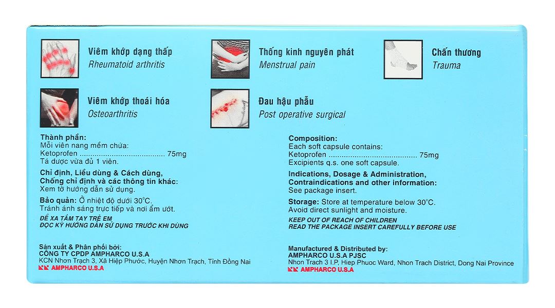 Do đó, ketoprofen bị chống chỉ định trong ba tháng cuối thai kỳ. Thời kỳ cho con bú Không rõ thuốc có bài tiết qua sữa mẹ hay không. Như với các thuốc khác bài tiết qua sữa mẹ, ketoprofen không được khuyến cáo dùng cho phụ nữ cho con bú. – Khả năng lái xe và vận hành máy mócSử dụng Ketoprofen có thể làm bệnh nhân cảm thấy chóng mặt, buồn ngủ và ảnh hưởng đến thị lực. Do đó, bệnh nhân không nên lái xe hay vận hành máy, trừ khi bệnh nhân đánh giá chắc chắn tác dụng của thuốc đối với cơ thể họ, cũng như bệnh nhân có thể thực hiện những hoạt động đó một cách an toàn. – Tương tác thuốcThuốc chống đông (như heparin và warfarin) và thuốc chống kết tập tiểu cầu (như ticlopidin, clopidogrel): Làm tăng nguy cơ chảy máu. Nếu không thể tránh sử dụng đồng thời, nên theo dõi chặt chẽ bệnh nhân. Li-ti: Có nguy cơ tăng nồng độ li-ti trong huyết tương, đôi khi tăng đến nồng độ gây độc, do giảm thải trừ li-ti qua thận. Khi cần, nên theo dõi sát nồng độ li-ti trong huyết tương và điều chỉnh liều li-ti trong và sau khi điều trị với các thuốc NSAID. Các thuốc giảm đau, thuốc NSAID khác (bao gồm các thuốc ức chế chọn lọc cyclooxygenase-2) và các salicylat liều cao: Tránh dùng đồng thời từ hai thuốc NSAID trở lên (bao gồm aspirin) vì điều này có thể làm tăng tác dụng phụ 24 của thuốc, đặc biệt là loét hoặc xuất huyết đường tiêu hóa. Methotrexat: Tương tác thuốc nghiêm trọng đã được ghi nhận khi US, dùng liều cao methotrexat cùng với các thuốc NSAID, bao gồm ketoprofen, do giảm thải trừ methotrexat. Với liều trên 15mg/tuần: Nguy cơ gây độc máu của methotrexat tăng, đặc biệt khi dùng liều cao (> 15mg/tuần), có thể liên quan với sự chiếm chỗ của methotrexat gắn kết với protein và sự giảm thanh thải của nó qua thận. Với liều dưới 15mg/tuần: Trong những tuần đầu điều trị phối hợp, xét nghiệm tổng phân tích tế bào máu nên được theo dõi chặt chẽ hàng tuần. Nếu có bất kỳ thay đổi nào của chức năng thận hoặc nếu bệnh nhân là người già, thì sự theo dõi phải được thực hiện thường xuyên hơn. Mifepriston: Không nên dùng các thuốc NSAID trong khoảng 8 – 12 ngày sau khi dùng mifepriston vì các thuốc NSAID có thể làm giảm hiệu quả của mifepriston. Pentoxifyllin: Tăng nguy cơ chảy máu. Theo dõi lâm sàng thường xuyên hơn và theo dõi thời gian Chảy máu là cần thiết. Thuốc hạ huyết áp (thuốc chẹn beta thuốc ức chế men chuyển, thuốc lợi tiểu): Có nguy cơ làm giảm hiệu lực của thuốc hạ huyết áp (do các thuốc NSAID ức chế khả năng gây giãn mạch của prostaglandin). Thuốc lợi tiểu: Có nguy cơ làm giảm hiệu lực của thuốc lợi tiểu. Các bệnh nhân và đặc biệt là bệnh nhân mất nước do dùng | thuốc lợi tiểu có nguy cơ suy thận thứ cấp cao hơn do giảm tưới máu thận vì ức chế prostaglandin. Với các bệnh nhân này cần bù nước trước khi bắt đầu trị liệu phối hợp và theo dõi chức năng thận khi bắt đầu điều trị. Glycosid tim: Các thuốc NSAID có thể gây bộc phát suy tim, giảm độ lọc cầu thận và làm tăng nồng độ glycoside tim trong huyết tương. Ciclosporin: Tăng nguy cơ độc cầu thận, đặc biệt là ở người già. Corticosteroid: Tăng nguy cơ loét hoặc xuất huyết tiêu hóa. Kháng sinh nhóm quinolon: Các dữ liệu nghiên cứu trên động vật chỉ ra rằng các thuốc NSAID có thể làm tăng nguy cơ co giật khi dùng chung với kháng sinh nhóm quinolon. Bệnh nhân dùng NSAID và kháng sinh nhóm quinolon có thể làm tăng nguy cơ co giật. Tacrolimus: Có thể có nguy cơ độc thận khi dùng chung NSAID với tacrolimus, đặc biệt là trên người già. Probenecid: Dùng đồng thời với probenecid có thể làm giảm rõ rệt độ thanh thải trong huyết tương của ketoprofen. Thuốc ức chế men chuyển và thuốc kháng angiotensin II: Ở những bệnh nhân có tổn thương chức năng thận (như bệnh nhân mất nước hoặc người già), dùng đồng thời thuốc ức chế men chuyển hoặc thuốc kháng angiotensin II với thuốc ức chế cyclooxygenase-2 có thể dẫn đến suy giảm hơn nữa chức năng thận, bao gồm khả năng suy thận cấp. Zidovudin: Tăng nguy cơ độc tính trên huyết học khi dùng chung NSAID với zidovudin. Có bằng chứng tăng nguy cơ tụ máu khớp và khối máu tụ ở những bệnh nhân rối loạn đông máu (haemophilia) HIV (+) được điều trị đồng thời zidovudin và ibuprofen. |