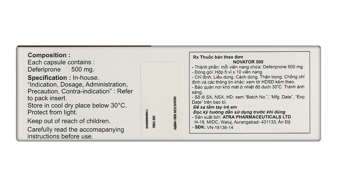 Novator 500 điều trị quá liều sắt ở bệnh nhân thalassaemia (5 vỉ x 10 viên)