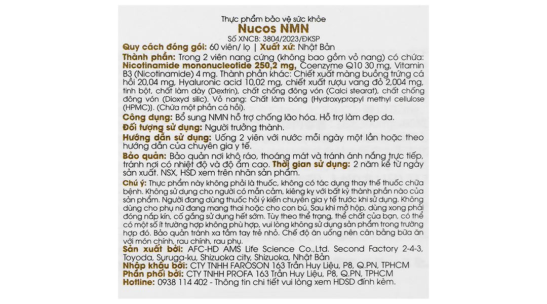 - Ngoài NMN, sản phẩm còn bổ sung Coenzyme Q10, Vitamin B3, chiết xuất rượu vang đỏ, chiết xuất buồng trứng cá hồi và Hyaluronic acid, mang lại hiệu quả toàn diện cho làn da và sức khỏe của bạn. Viên uống Nucos NMN là giải pháp lý tưởng cho những ai mong muốn duy trì vẻ trẻ trung trong suốt thời gian dài.