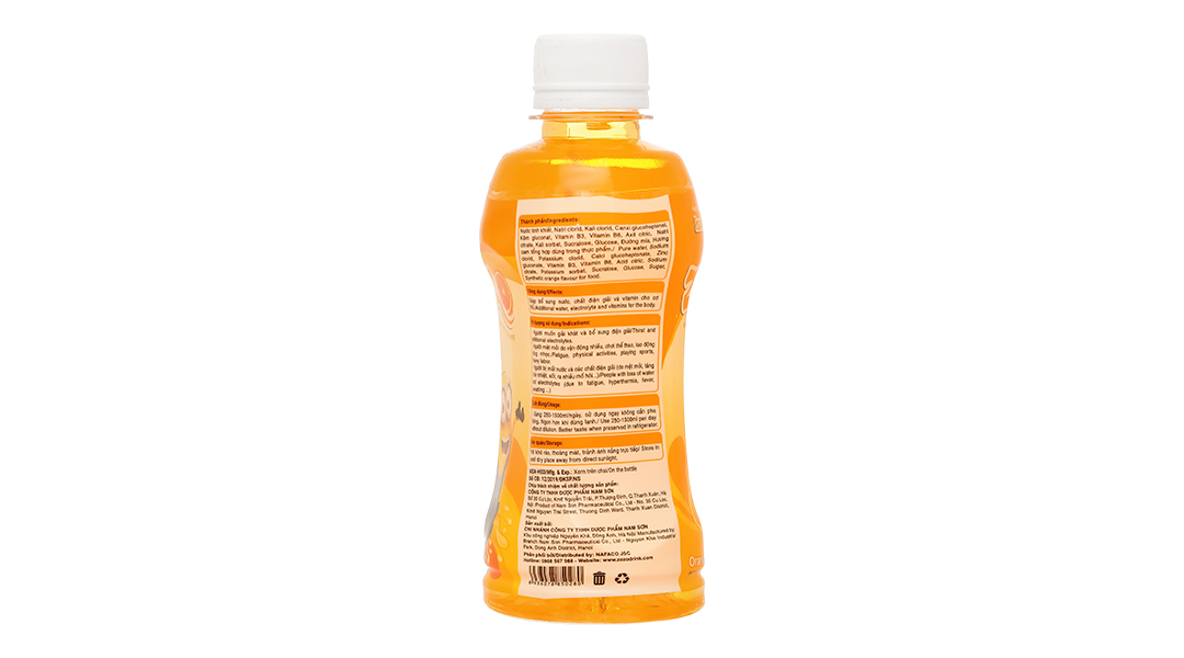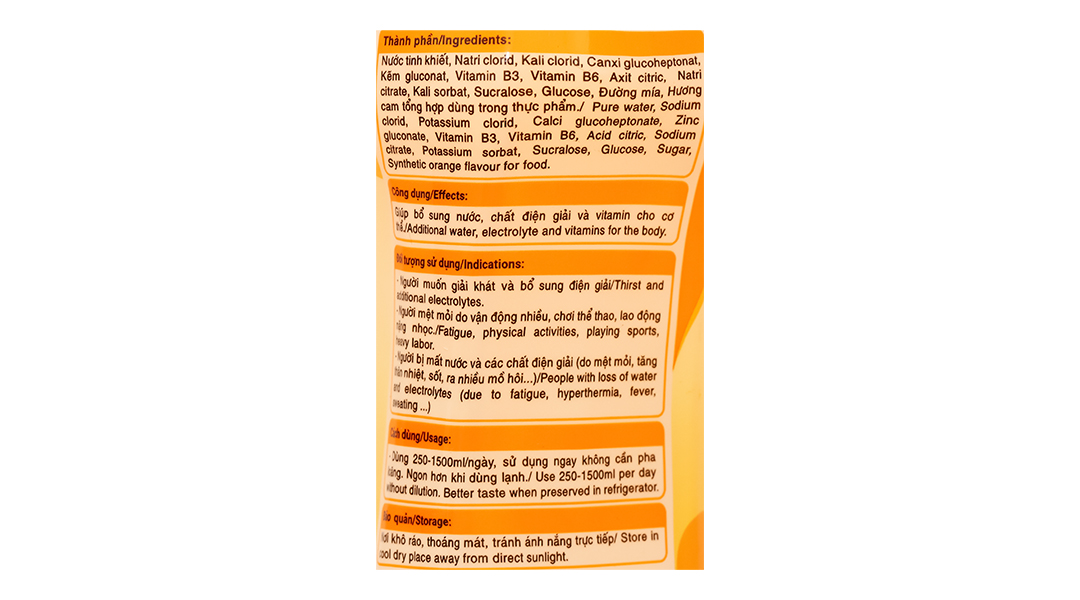 Nước tinh khiết, Natri clorid, Kali clorid, Canxi glucoheptonat, Kẽm gluconat, Vitamin B3, Vitamin B6, Axit citric, Natri citrate, Kali sorbat, Sucralose, Glucose, Đường mía, Hương cam tổng hợp dùng trong thực phẩm./ Pure Water, Sodium clorid, Potassium clorid, Calci glucoheptonate, Zinc gluconate, Vitamin B3, Vitamin B6, Acid citric, Sodium citrate, Potassium sorbat, Sucralose, Glucose, Sugar, Synthetic orange flavour for food.