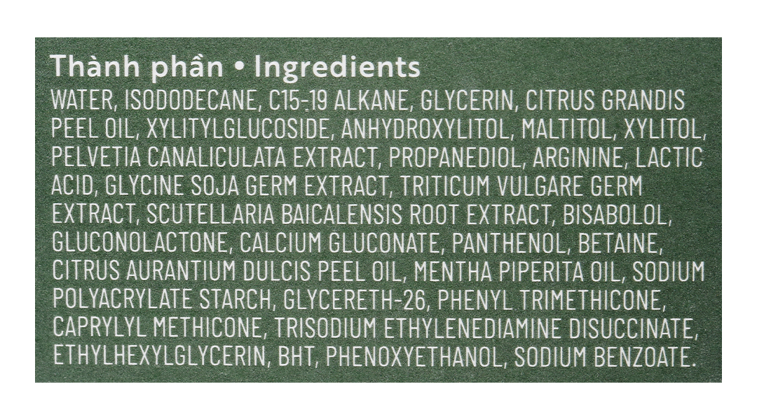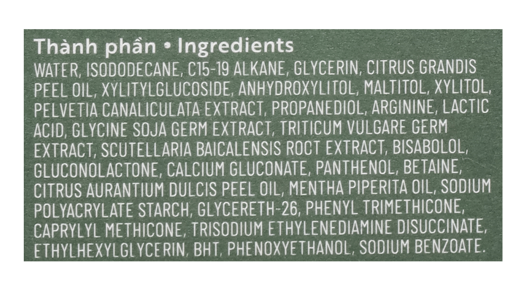 Water, isododecane, c15-19 alkane, glycerin, citrus grandis peel oil, xylitylglucoside, anhydroxylitol, maltitol, xylitol, pelvetia canaliculata extract, propanediol, arginine, lactic acid, glycine soja germ extract, triticum vulgare germ extract, scutellaria baicalensis root extract, bisabolol, gluconolactone, calcium gluconate, panthenol, betaine, citrus aurantium dulcis peel oil, mentha piperita oil, sodium polyacrylate starch, glycereth-26, phenyl trimethicone, caprylyl methicone, trisodium ethylenediamine disuccinate, ethylhexylglycerin, BHT, phenoxyethanol, sodium benzoate.