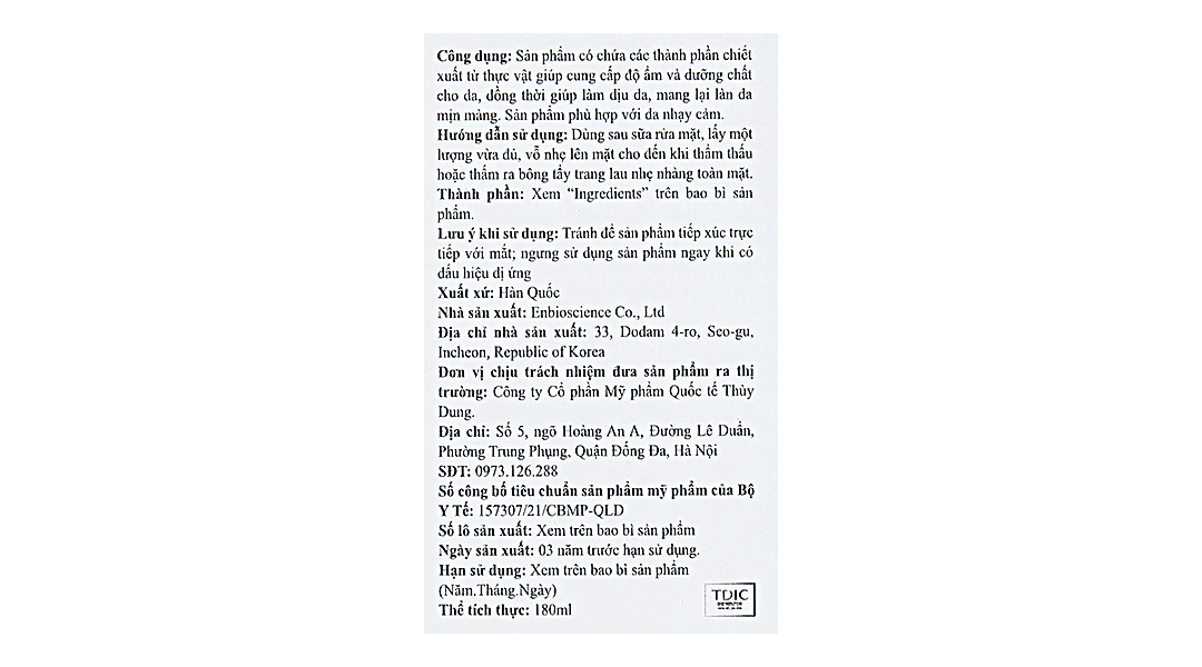 Thành phần chínhWater, Butylene Glycol, Dimethyl Sulfone, Betaine, Caprylic/Capric Triglyceride, Disodium EDTA, Glycyrrhiza Glabra (Licorice) Root Extract, Centella Asiatica Extract, Chlorphenesin, Tocopheryl Acetate, Glycerin, Arginine, Carbomer, Panthenol, Luffa Cylindrica Fruit/Leaf/Stem Extract, 1,2-Hexanediol, Hydroxyethylcellulose, Aloe Barbadensis Leaf Extract, Althaea Rosea Flower Extract, Portulaca Oleracea Extract, Polyquaternium-51, Beta-Glucan, Lysine HCL, Sodium Ascorbyl Phosphate, Sodium Hyaluronate, Acetyl Methionine, Theanine, Proline, Natto Gum, Disodium Phosphate, Polysorbate 60, Sodium Phosphate, Copper Tripeptide-1.