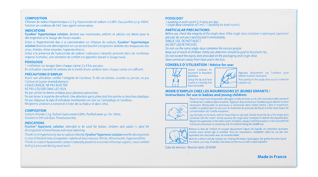 - Fysoline Hypertonic solution là dung dịch nước muối ưu trương, được chứng nhận vô trùng loại A theo tiêu chuẩn CE tại châu Âu.