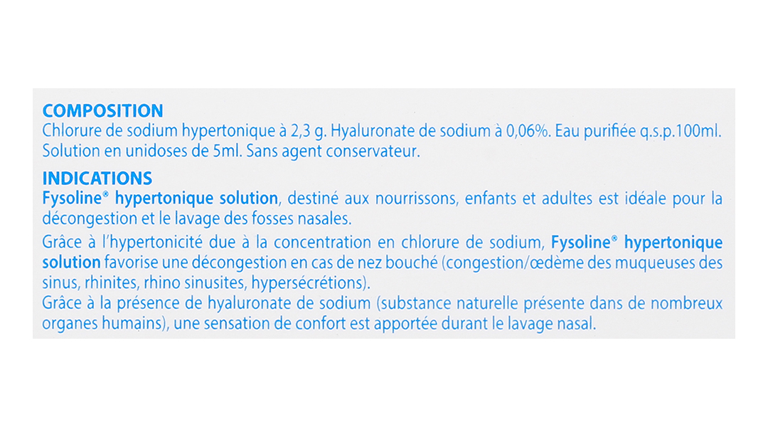 - Với thành phần Natri Clorid 2,3% ưu trương giảm phù nề niêm mạc, natri hyaluronat duy trì và cấp ẩm niêm mạc mũi, Fysoline Hypertonic solution hỗ trợ giảm ngạt mũi, khô mũi hiệu quả.