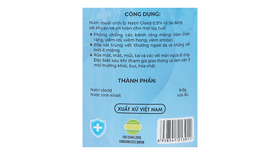 Nước muối Natri Clorid 0,9% có tác dụng sát khuẩn và an toàn cho mọi lứa tuổi.
