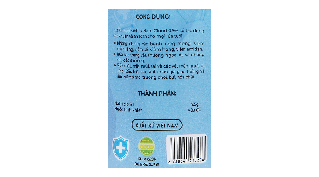 Nước muối Natri Clorid 0,9% có tác dụng sát khuẩn và an toàn cho mọi lứa tuổi.