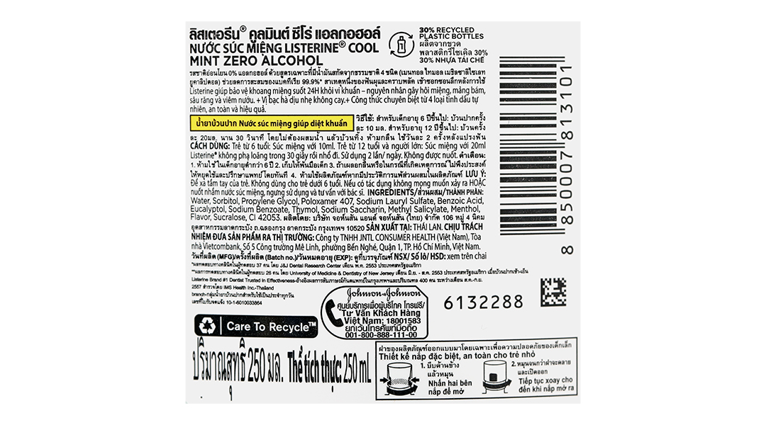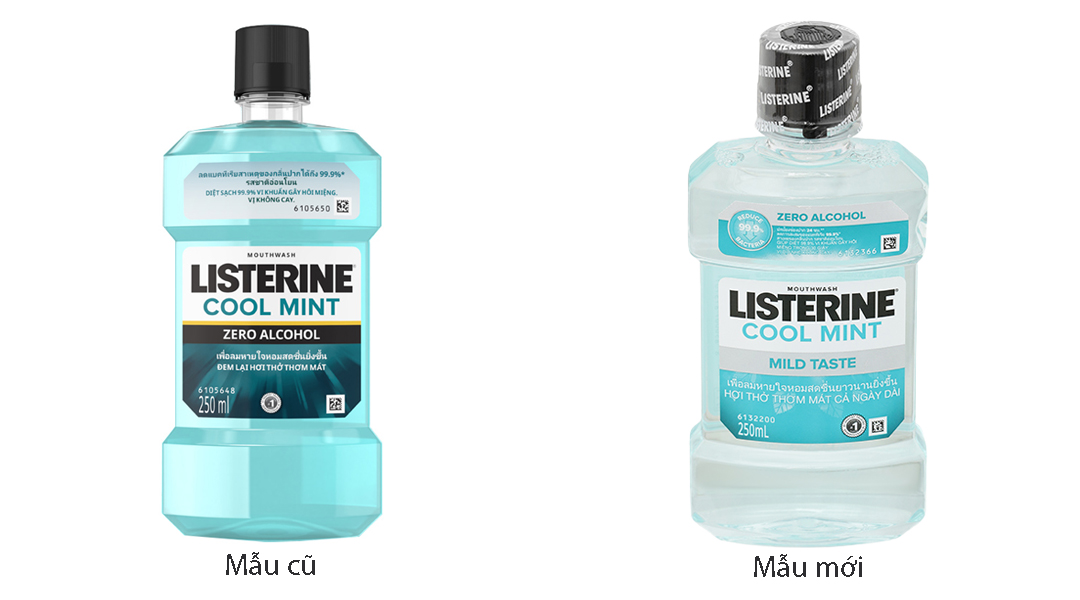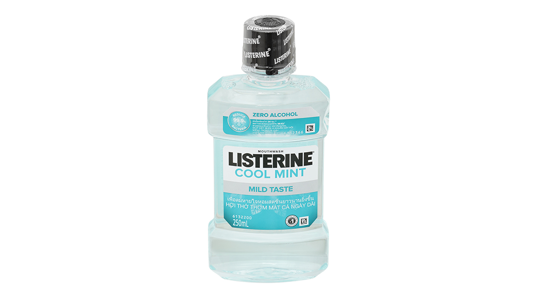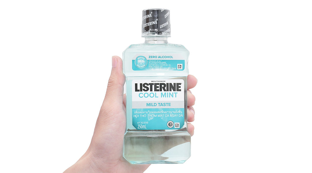 Listerine Cool Mint không cay 250ml không chứa cồn với vị nhẹ nhàng, không cay.