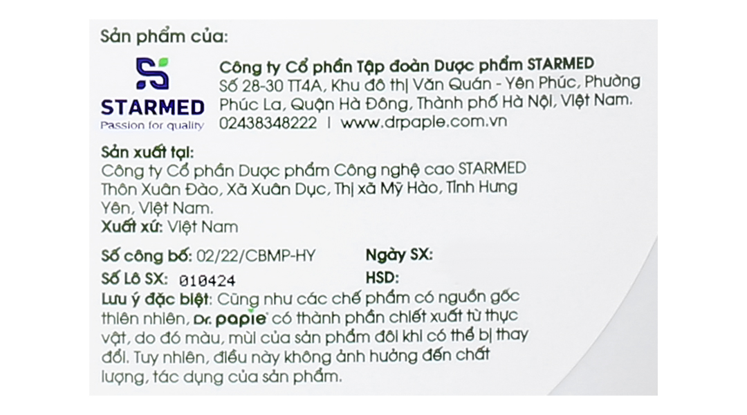 Cũng như các chế phẩm có nguồn gốc thiên nhiên, Dr. Papie có thành phần chiết xuất từ thực vật, do đó màu, mùi của sản phẩm đôi khi có thể bị thay đổi. Tuy nhiên, điều này không ảnh hưởng đến chất lượng, tác dụng của sản phẩm.