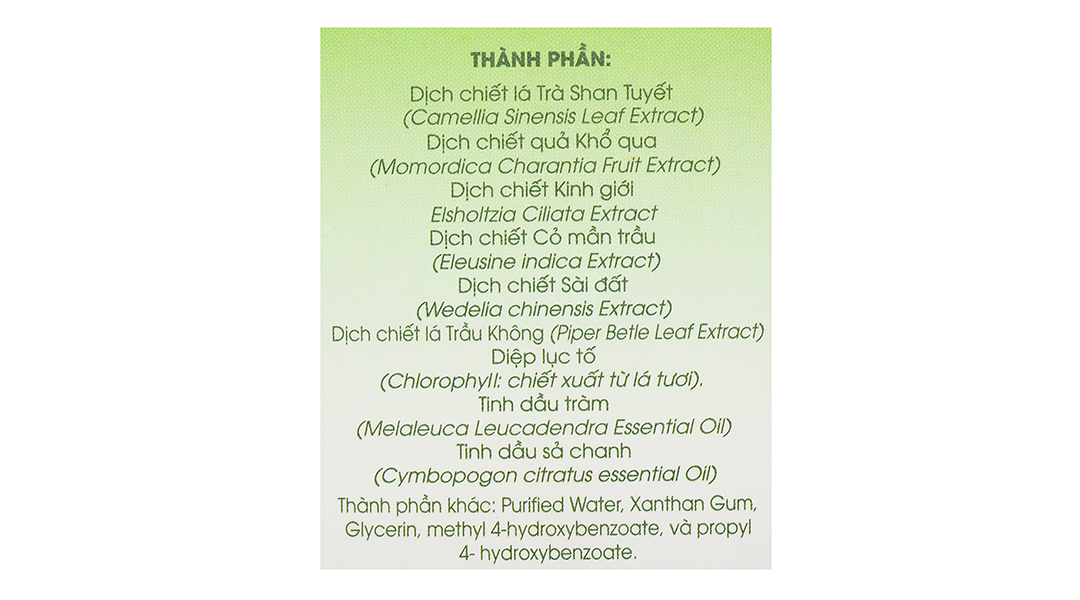 Thành phần khác: Purified Water, Xanthan Gum, Glycerin, methyl 4-hydroxybenzoate, và propyl 4-hydroxybenzoate.