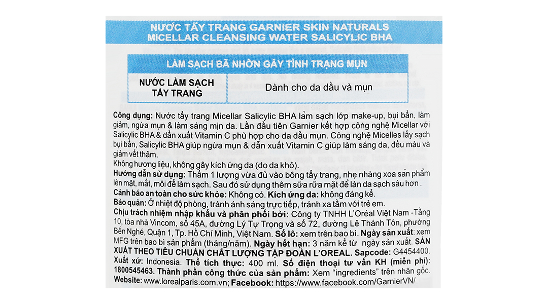 Tẩy trang Micellar Salicylic BHA làm sạch lớp make-up, bụi bẩn, làm giảm, ngừa mụn & làm sáng mịn da. Lần đầu tiên Garnier kết hợp công nghệ Micellar với Salicylic BHA & dẫn xuất Vitamin C phù hợp cho da dầu mụn. Công nghệ Micelles lấy sạch bụi bẩn, Salicylic BHA giúp ngừa mụn & dẫn xuất Vitamin C giúp làm sáng da, đều màu và giảm vết thâm.