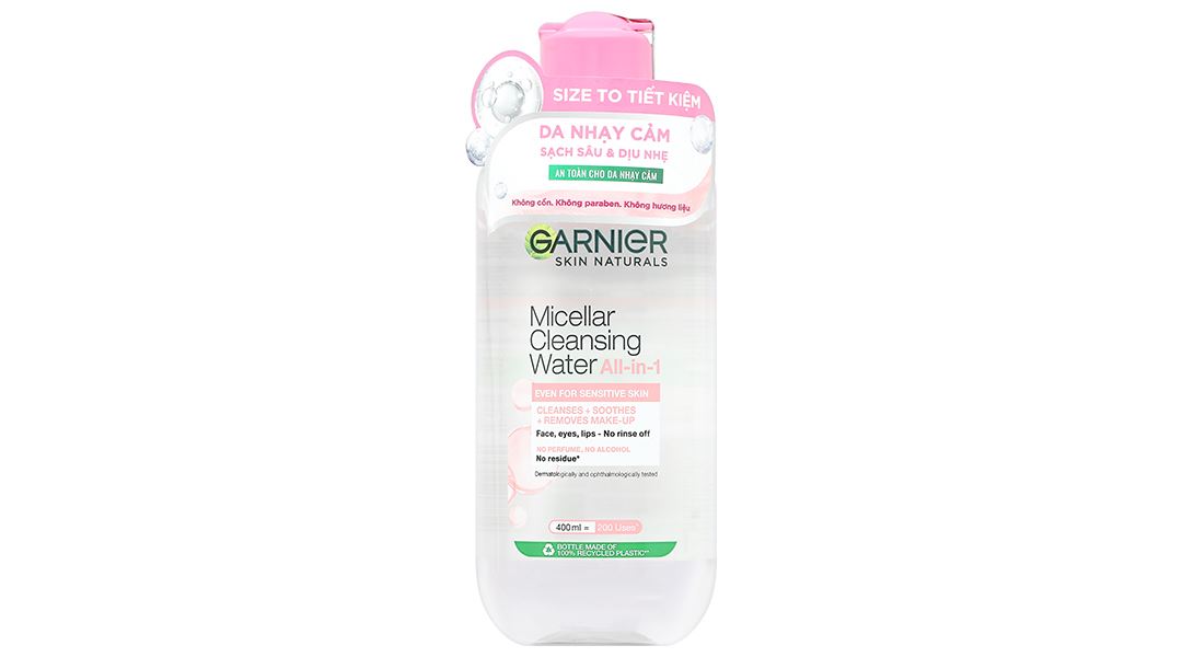 Nước Làm Sạch Và Tẩy Trang Cho Da Nhạy Cảm Micellar Water GARNIER 400ML là dòng sản phẩm nước làm sạch và tẩy trang đa năng được thiết kế chuyên biệt dành cho làn da nhạy cảm, giúp làm sạch hiệu quả mà không gây tổn hại cho làn da của bạn. Sản phẩm chăm sóc da 3 trong 1 này có thể được sử dụng như một sản phẩm làm sạch, toner hoặc tẩy trang – với công nghệ Micelles chứa các hạt phân tử micelles giúp loại bỏ bụi bẩn, dầu thừa và lớp trang điểm theo cơ chế hoạt động của nam châm mà không cần chà xát mạnh, không cần rửa lại với nước.