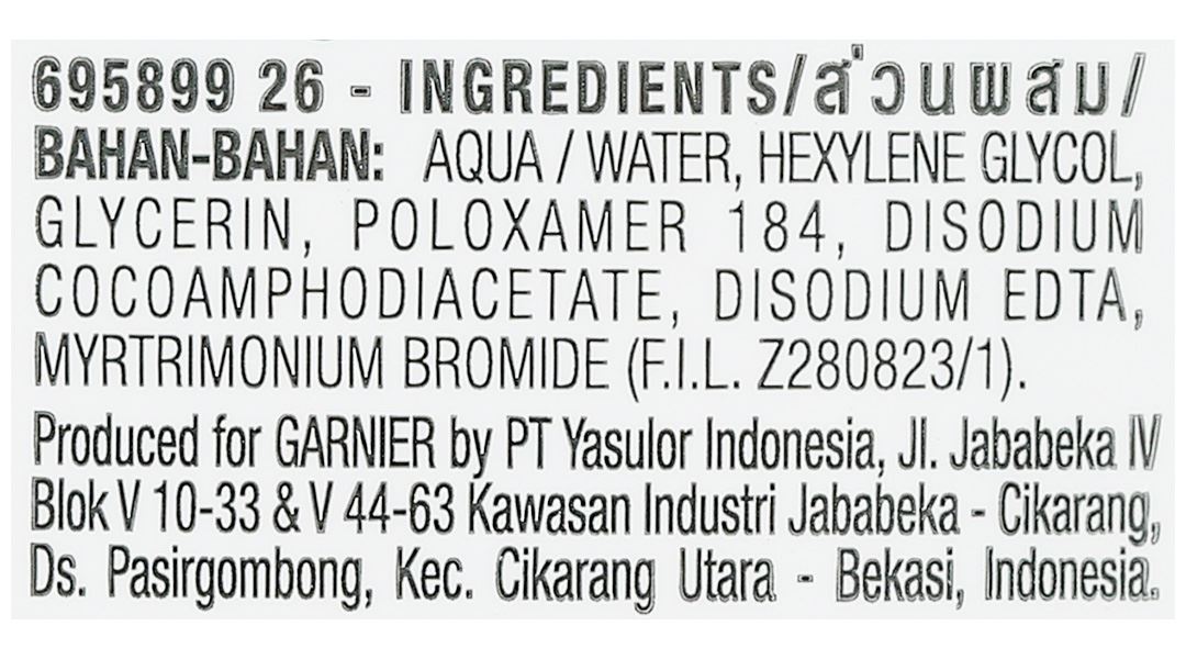 Aqua/Water, Hexylene glycol, Glycerin, Poloxamer 184, Disodium cocoamphodiacetate, Disodium edta, Myrtri monium bromide (F.I.L. Z280823/1).