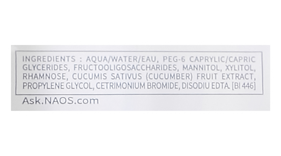 Aqua/Water/Eau, Peg-6 Caprylic/Capric Glycerides, Fructooligosaccharides, Mannitol, Xylitol, Rhamnose, Cucumis Sativus (Cucumber) Fruit Extract, Propylene Glycol, Cetrimonium Bromide, Disodium EDTA. [Bi 446]