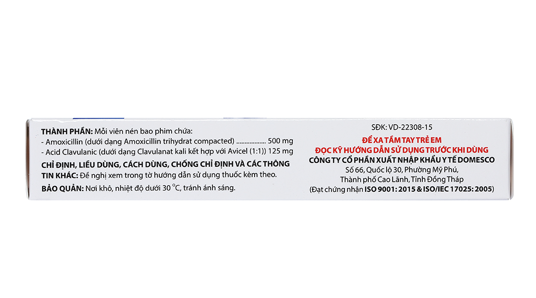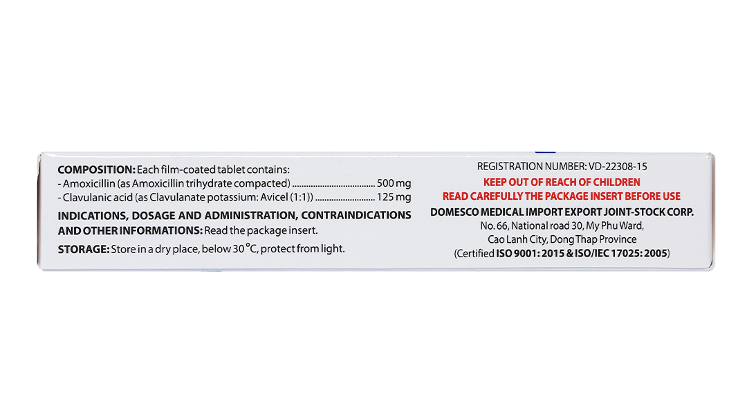 Amoxicillin (dưới dạng Amoxicillin trihydrat compacted) 500mg, Acid Clavulanic (dưới dạng Clavulanat kali kết hợp với Avicel (1:1)) 125mg.