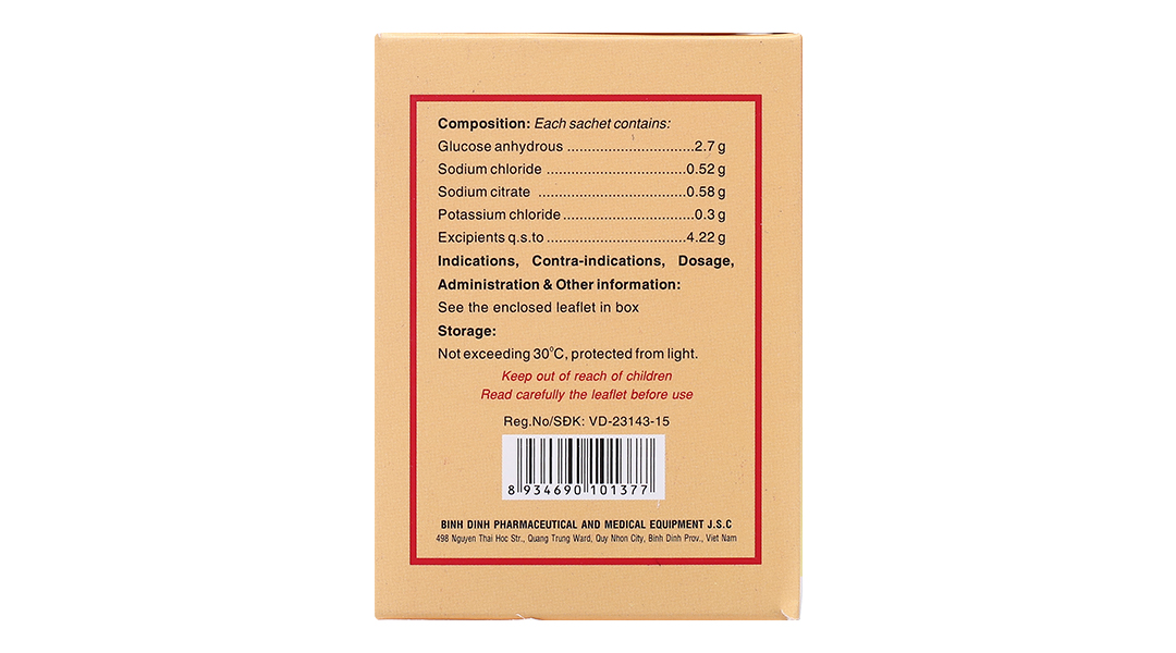 - Glucose khan 2,7g, Natri clorid 0,52g, Natri citrat 0,58g, Kali clorid 0,3g.