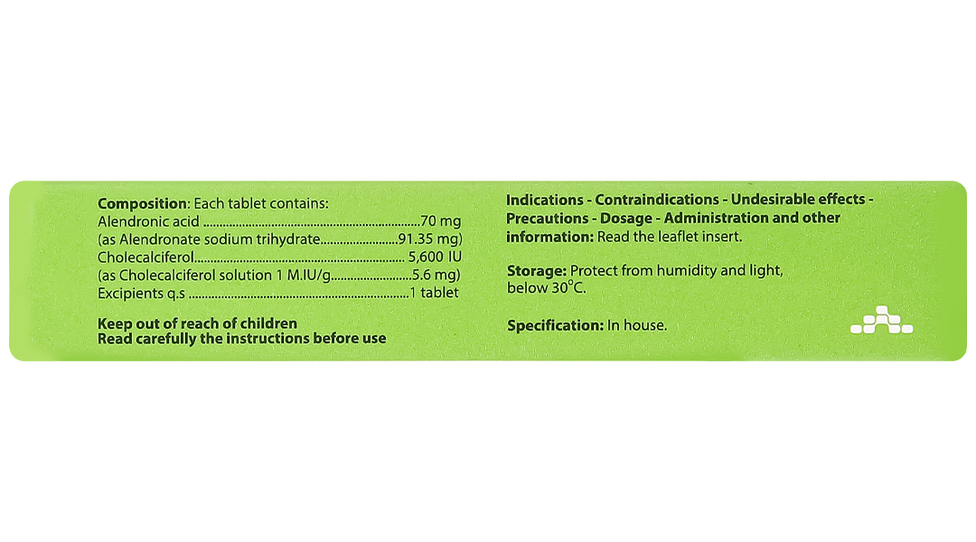 – Thai kỳ và cho con búThuốc này được chỉ định dùng cho phụ nữ mãn kinh, không dùng cho phụ nữ có thai và phụ nữ đang cho con bú. – Khả năng lái xe và vận hành máy mócChưa có bằng chứng về ảnh hưởng của thuốc lên khả năng lái xe, vận hành máy móc nhưng nên thận trọng vì đã có báo cáo tác dụng phụ tuy hiếm gặp là ảo thính giác, rối loạn thị giác. – Tương tác thuốcTương tác: Liên quan đến alendronat: – Estrogen: An toàn và hiệu quả của việc sử dụng đồng thời liệu pháp thay thế hormon và alendronat cho phụ nữ sau mãn kinh chưa được xác định, vì vậy khuyến cáo không nên dùng đồng thời. – Sữa, các chất bổ sung calci, magnesi hoặc các thuốc chứa nhôm (chống acid): Có thể làm giảm hấp thu alendronat. Vì vậy người bệnh phải chờ ít nhất nửa giờ sau khi uống alendronat mới dùng bất kỳ thuốc nào khác. – Ranitidin tiêm tĩnh mạch làm tăng sinh khả dụng alendronat đường uống. – Thuốc chống viêm không steroid (NSAID): Dùng phối hợp với alendronat có thể tăng nguy cơ loét dạ dày, nên phải thận trọng khi phối hợp. – Sắt: Thuốc uống có sắt làm giảm hấp thu alendronat. – Kháng sinh aminoglycosid: Tăng nguy cơ giảm calci huyết nếu được dùng đồng thời. Liên quan đến cholecalciferol: – Không nên dùng đồng thời với các glycosid trợ tim vì độc tính của glycosid trợ tim tăng do tăng calci huyết, dẫn đến loạn nhịp tim. – Không nên dùng đồng thời với corticosteroid vì corticosteroid làm cản trở tác dụng của vitamin D. – Dùng đồng thời với cholestyramin, colestipol hydroclorid có thể làm giảm hấp thu vitamin D qua đường tiêu hóa. – Dùng đồng thời với thuốc lợi tiểu thiazid cho những người suy cận giáp có thể dẫn đến tăng calci huyết. Dùng đồng thời với phenobarbital, phenytoin có thể làm giảm nồng độ các chất chuyển hóa của vitamin D trong huyết tương và tăng chuyển hóa vitamin D thành những chất không có hoạt tính. Tương kỵ: Do không có các nghiên cứu về tính tương kỵ của thuốc, không trộn lẫn thuốc này với các thuốc khác. |