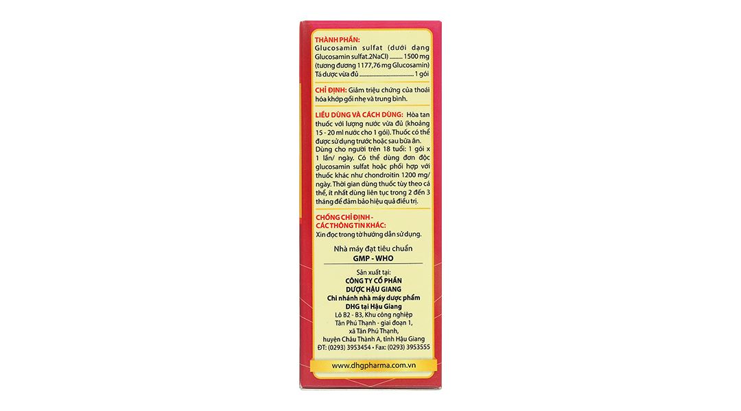 - Dùng cho người trên 18 tuổi: 1 gói x 1 lần/ ngày. Có thể dùng đơn độc glucosamin sulfat hoặc phối hợp với thuốc khác như chondroitin 1200 mg/ ngày. Thời gian dùng thuốc tùy theo cá thể, ít nhất dùng liên tục trong 2 đến 3 tháng để đảm bảo hiệu quả điều trị.