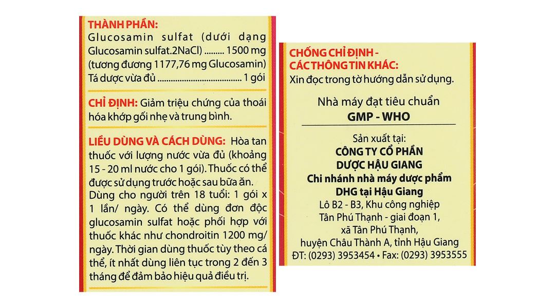 - Glucosamin sulfat (dưới dạng Glucosamin sulfat.2NaCl) 1500mg (tương đương 1177,76 mg Glucosamin).