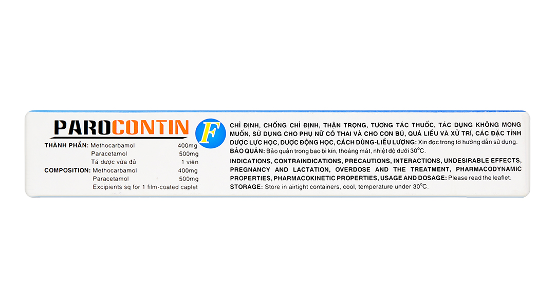 Parocontin với sự kết hợp giữa methocarbamol và paracetamol nên có tác dụng ức chế thần kinh dẫn truyền cảm giác đau hoặc ức chế dẫn truyền cảm giác đau đến não trong các trường hợp đau liên quan đến co thắt cơ – xương.