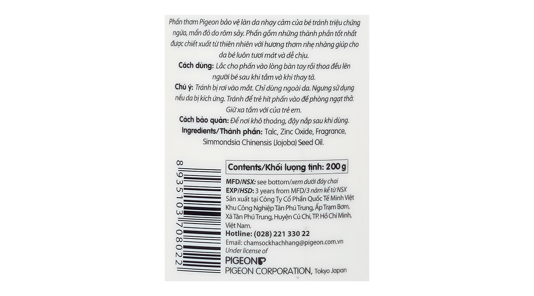 - Phấn thơm Pigeon bảo vệ làn da nhạy cảm của bé tránh triệu chứng ngứa, mẩn đỏ do rôm sảy.