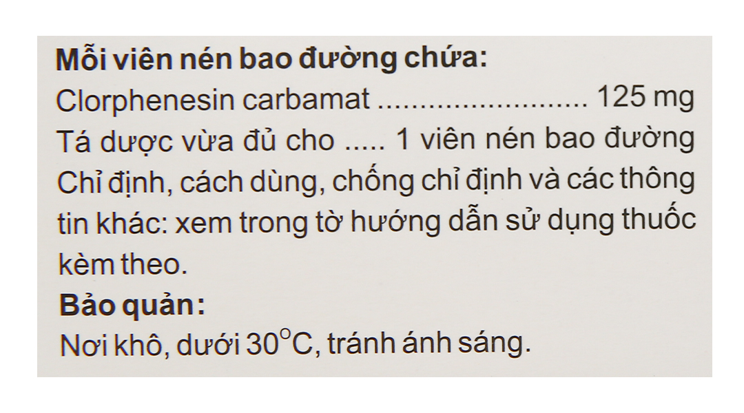 Thành phần hoạt chất: Clorphenesin carbamat 125mg.
