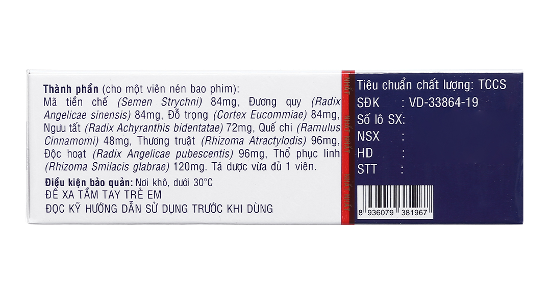 - Mã tiền chế (Semen Strychni) 84mg, Đương quy (Radix Angelicae sinensis) 84mg, Đỗ trọng (Cortex Eucommiae) 84mg, Ngưu tất (Radix Achyranthis bidentatae) 72mg, Quế chi (Ramulus Cinnamomi) 48mg, Thương truật (Rhizoma Atractylodis) 96mg, Độc hoạt (Radix Angelicae pubescentis) 96mg, Thổ phục linh (Rhizoma Smilacis glabrae) 120mg.