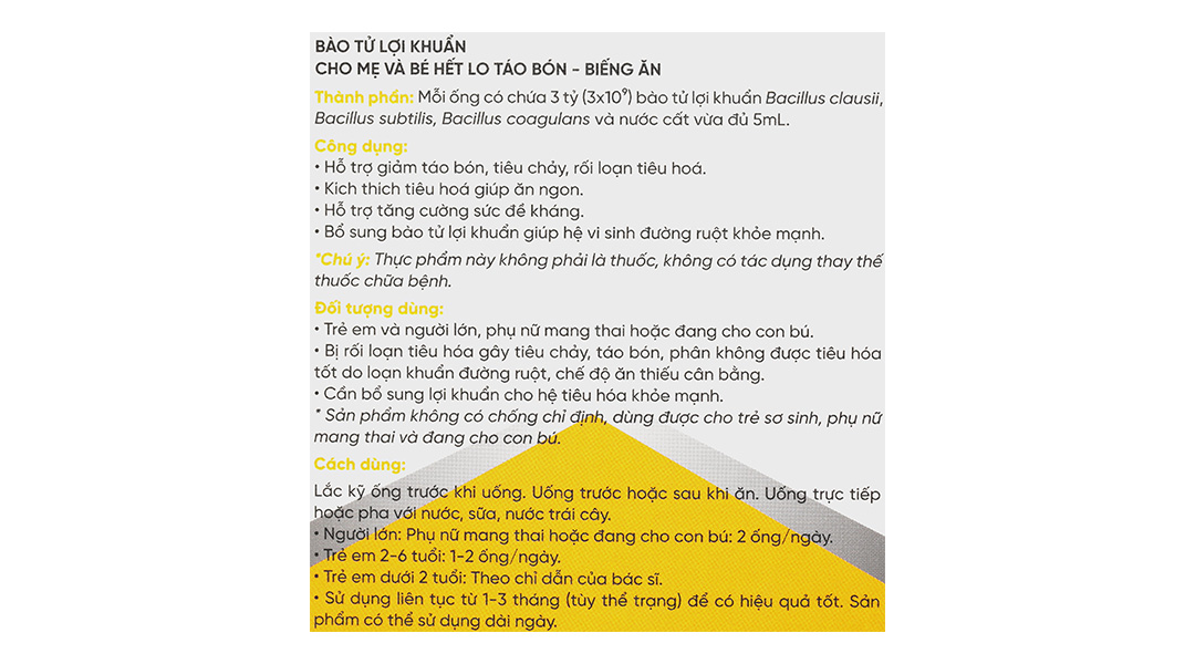 Mỗi ống có chứa 3 tỷ (3 x 109) bào tử lợi khuẩn Bacillus clausii, Bacillus subtilis, Bacillus Coagulans và Nước cất vừa đủ 5ml.