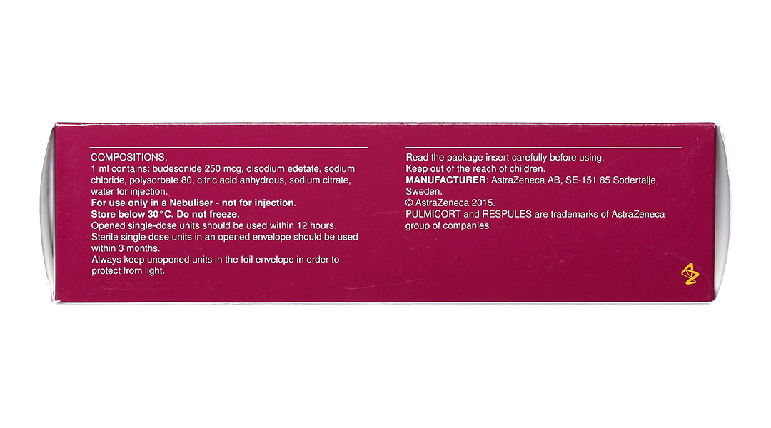 - Hoạt chất: Mỗi 1ml chứa 250 mcg budesonide. Hỗn dịch khí dung. Hộp 4 gói, mỗi gói chứa 5 ống Respules x 2ml.