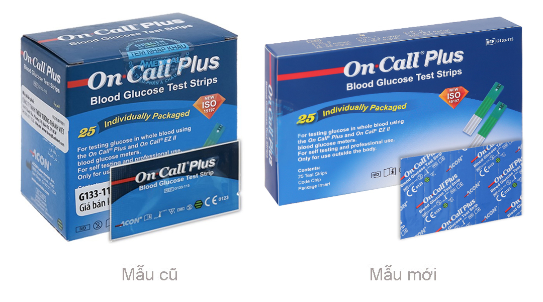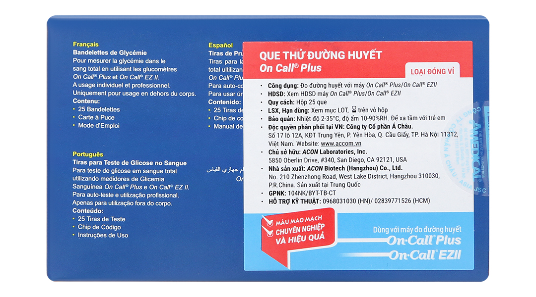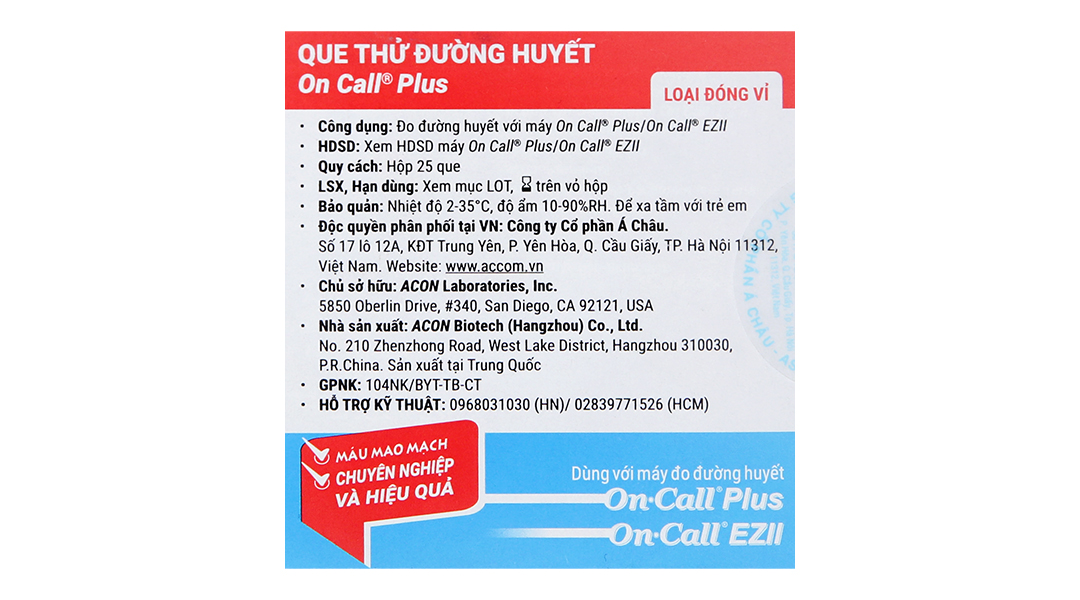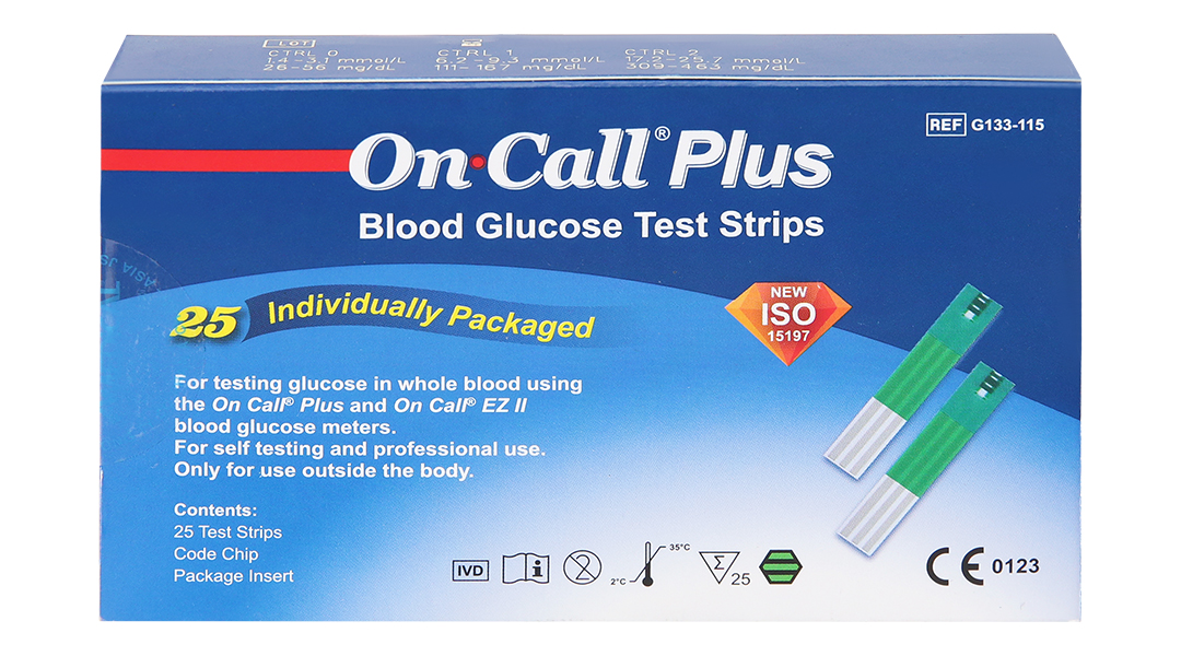 - Sản phẩm tương thích với máy đo đường huyết On Call Plus hoặc On Call EZ II để đo nồng độ đường huyết của mẫu máu toàn phần; được sử dụng bởi người mắc tiểu đường tại nhà và bởi bác sĩ tại các cơ sở y tế để định lượng nồng độ đường huyết trong mẫu toàn phần mao mạch từ đầu ngón tay, cẳng tay và gan bàn tay.