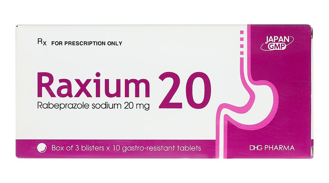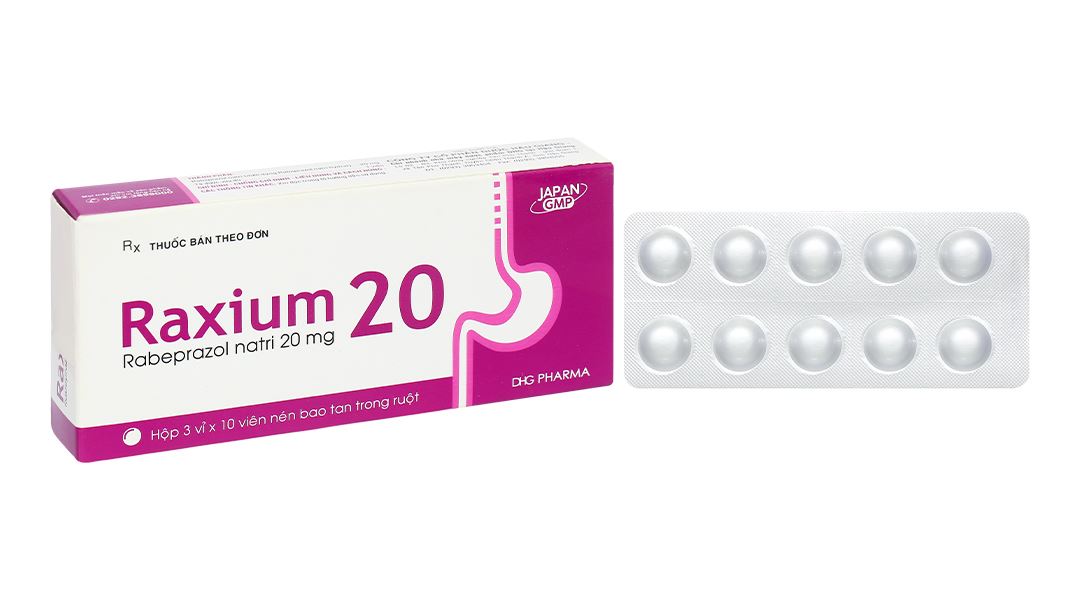 - Raxium 20 với thành phần hoạt chất là rabeprazol natri, thuộc nhóm thuốc kháng tiết acid, không có đặc tính kháng tiết cholin hay đối kháng histamin H2 nhưng ức chế sự tiết acid của dạ dày bằng cách ức chế chuyên biệt enzym H+/K+ – ATPase (bơm acid hay bơm proton). Hiệu quả tỷ lệ với liều lượng và ức chế cả sự tiết acid cơ bản lẫn sự tiết acid do kích thích bất kể tác nhân kích thích nào. Vì là một bazơ yếu nên rabeprazol nhanh chóng được hấp thu và tập trung vào môi trường acid của tế bào thành. Rabeprazol được chuyển thành dạng sulphenamid có hoạt tính qua sự proton hóa và sau đó phản ứng với cystein có sẵn ở bơm proton.