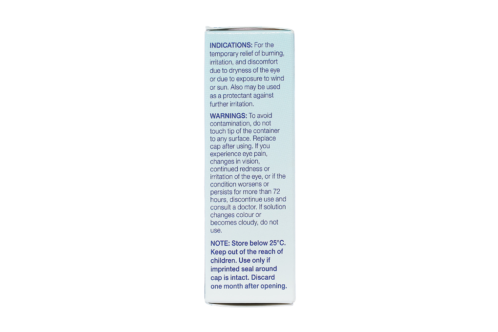 Làm giảm tạm thời cảm giác nóng, kích ứng và khó chịu do khô mắt hoặc do tiếp xúc với gió hay ánh nắng. Thuốc có thể được dùng như một chất bảo vệ tránh kích ứng mắt thêm nữa.