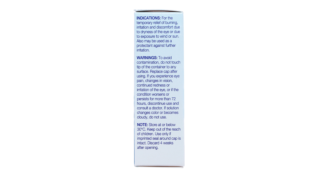 Làm dịu nhất thời cảm giác nóng rát, kích ứng và khó chịu do khô mắt hoặc do tiếp xúc với gió hay ánh nắng. Thuốc còn được dùng như một chất bảo vệ chống lại các kích thích khác