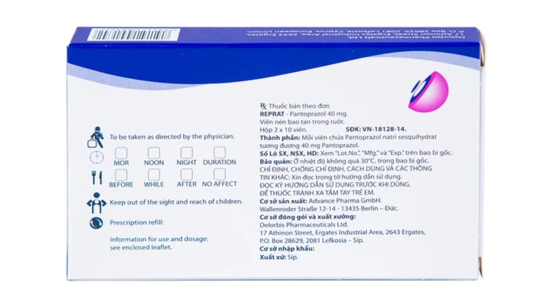 – Thận trọng khi sử dụngSuy gan Phải giám sát thường xuyên men gan ở bệnh nhân suy gan nặng trong suốt thời gian điều trị với pantoprazol, đặc biệt khi sử dụng lâu dài. Trong trường hợp tăng men gan, nên ngưng điều trị. Liệu pháp phối hợp Trong liệu pháp phối hợp, nên quan tâm đến đặc tính của các thuốc dùng phối hợp. Hiện diện các triệu chứng cảnh báo Khi có sự hiện diện bất kỳ triệu chứng cảnh báo như giảm cân đáng kể không do chủ ý, nôn lặp lại, khó nuốt, nôn ra máu, thiếu máu hoặc melanin máu và khi nghi ngờ hoặc bị loét dạ dày, nên loại trừ khối u ác tính, vì việc điều trị với pantoprazol có thể làm giảm các triệu chứng và làm chậm việc chắn đoán. Nếu các triệu chứng vẫn còn mặc dù đã được điều trị đầy đủ, cần phải tìm hiểu kỹ nguyên nhân. Dùng đồng thời với atazanavir Không khuyến cáo dùng đồng thời atazanavir với PPI. Nếu sự phối hợp atazanavir với PPI là cần thiết, khuyến cáo phải theo dõi lâm sàng chặt chẽ (mức virus trong máu) khi tăng liều atazanavir đến 400 mg và 100 mg ritonavir. Liều pantoprazol không được vượt quá 20 mg/ngày. Ảnh hưởng trên sự hấp thu vitamin B12 Ở bệnh nhân bị hội chứng Zollinger Ellison và các tình trạng tăng tiết bệnh lý khác cần phải điều trị dài hạn, cũng như các thuốc ức chế tiết acid, pantoprazol có thể làm giảm sự hấp thu vitamin B12 (cyanocobalamin) do giảm hoặc thiếu acid dịch vị, Nên thận trọng ở các bệnh nhân giảm dự trữ hoặc có yếu tố nguy cơ giảm hấp thu vitamin B12 khi điều trị lâu dài hoặc nếu nhận thấy các triệu chứng lâm sàng liên quan. Điều trị dài hạn Trong điều trị dài hạn, đặc biệt khi điều trị > 1 năm, cần giám sát bệnh nhân thường xuyên. Nhiễm khuẩn tiêu hóa Cũng như các PPI khác, pantoprazol có thể làm tăng lượng vi khuẩn bình thường hiện diện ở đường tiêu hóa trên. Điều trị với Reprat có thể dẫn đến tăng nhẹ nguy cơ nhiễm khuẩn tiêu hóa do các vi khuẩn như Salmonella và Campylobacter. Giảm magiê máu Đã có báo cáo gặp phải giảm magiê máu nặng ở những bệnh nhân điều trị bằng PPI như Reprat, trong ít nhất 3 tháng, và trong phần lớn trường hợp trong 1 năm. Các biểu hiện nghiêm trọng của giảm magiê máu như mệt mỏi, co cứng cơ, mê sảng, co giật, choáng váng và loạn nhịp thất có thể xảy ra nhưng có thể nhẹ và không được chú ý. Ở phần lớn bệnh nhân gặp phải giảm magiê máu sẽ được cải thiện sau khi được bổ sung magiê và ngưng dùng PPI. Đối với những bệnh nhân cần điều trị lâu dài hoặc những người dùng PPI với digoxin hoặc với các thuốc có thể gây giảm magiê máu (như thuốc lợi tiểu), nên xem xét đo magiê trước khi bắt đầu điều trị và định kỳ trong suốt đợt điều trị với PPI. Các PPI, đặc biệt khi dùng liều cao và thời gian điều trị kéo dài (trên 1 năm), có thể gây tăng nhẹ nguy cơ gãy xương chậu, cổ tay và cột sống, chủ yếu ở người cao tuổi hoặc có những yếu tố nguy cơ khác. Một số khảo sát cho thấy các PPI có thể làm tăng nguy cơ gãy xương toàn bộ từ 10 – 40%, trong số này cũng có thể do các yếu tố nguy cơ khác. Những bệnh nhân có nguy cơ loãng xương nên được chăm sóc điều trị theo các hướng dẫn làm sàng hiện nay và nên dùng đủ vitamin D và calci . – Thời kỳ mang thai và cho con búThời kỳ mang thai Chưa có đầy đủ dữ liệu về việc dùng pantoprazol ở phụ nữ mang thai. Các nghiên cứu trên động vật cho thấy có độc tính liên quan sinh sản. Chưa rõ nguy cơ tiềm ẩn ở người. Không nên dùng Reprat trong lúc mang thai trừ khi thật sự cần thiết. Thời kỳ cho con bú Các nghiên cứu trên động vật cho thấy pantoprazol tiết vào sữa mẹ. Đã có báo cáo thuốc được tiết vào sữa người mẹ. Do đó quyết định nên tiếp tục/ngưng cho con bú hoặc tiếp tục/ngưng dùng Reprat cần cân nhắc giữa lợi ích cho con bú đối với đứa trẻ và lợi ích của liệu pháp Reprat đổi với người mẹ. – Khả năng lái xe và vận hành máy mócCác tác dụng bất lợi như choáng váng và rối loạn thị giác có thể xảy ra. Nếu bị gặp phải, bệnh nhân không nên lái xe hoặc vận hành máy móc. – Tương tác thuốcDo khả năng ức chế tiết acid ở dạ dày mạnh và kéo dài, pantoprazol có thể làm giảm sự hấp thu các thuốc có sinh khả dụng phụ thuộc vào pH dạ dày, như kháng nấm azol (ketoconazol, itraconazol, posaconazol), erlotinib. Dùng đồng thời atazanavir và các thuốc điều trị HIV khác có sự hấp thu phụ thuộc vào pH dạ dày với các chất ức chế bơm proton có thể dẫn đến giảm đáng kể sinh khả dụng các thuốc điều trị HIV và có thể ảnh hưởng đến hiệu quả của các thuốc này. Do đó không khuyên dùng các chất ức chế bơm proton với atazanavir. Mặc dù không nhận thấy có tương tác khi dùng đồng thời phenprocoumon hoặc warfarin trong các nghiên cứu dược lâm sàng. Tuy nhiên trong một vài trường hợp đặc biệt, thay đổi chỉ số INR được báo cáo gặp phải khi dùng đồng thời. Do đó, khu
