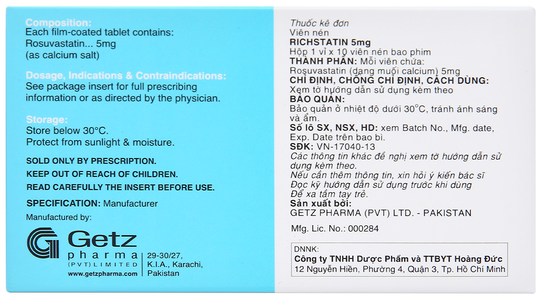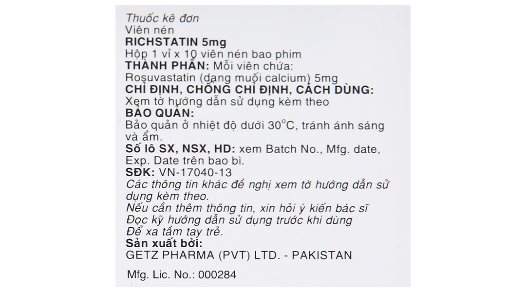 + Liều rosuvastatin từ 5 – 40mg, uống mỗi ngày một lần, tùy theo mục đích trị liệu và đáp ứng của bệnh nhân. Liều khởi đầu thông thường khuyến cáo cho Richstatin (rosuvastatin) là 10 mg/lần/ngày. Liều khởi đầu 5 mg/lần/ngày được áp dụng cho những bệnh nhân không có yêu cầu giảm LDL-Cholesterol tích cực hoặc những bệnh nhân có yếu tố dẫn đến bệnh cơ. Đối với những bệnh nhân tăng cholesterol huyết đáng kể (hàm lượng LDL-Cholesterol > 190 mg/dL) và đòi hỏi giảm lipid tích cực, có thể xem xét liều khởi đầu 20 mg. Sau liều khởi đầu, và/hoặc đồng thời với định lượng Richstatin (rosuvastatin), nên xét nghiệm nồng độ lipid huyết trong 2 – 4 tuần để điều chỉnh liều phù hợp.