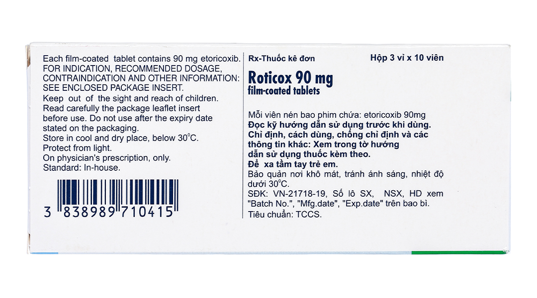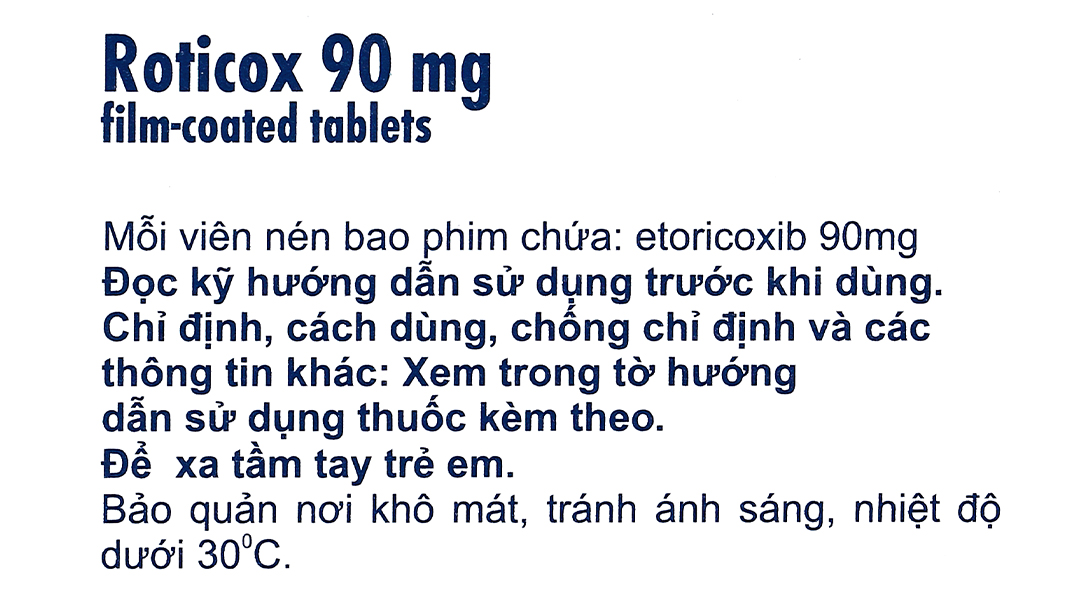 Roticox 90mg film – coated tablets: Mỗi viên nén bao phim chứa 90mg Etoricoxib.