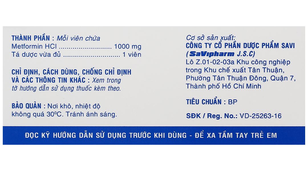 - Thành phần dược chất: Metformin hydroclorid: 1000mg.