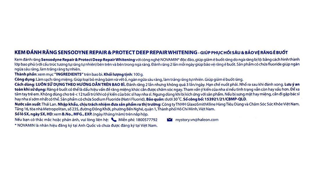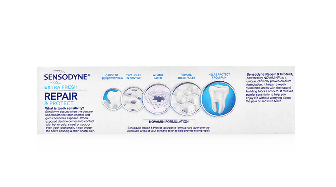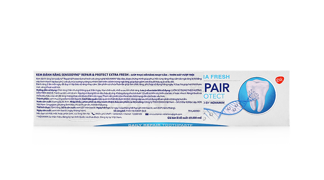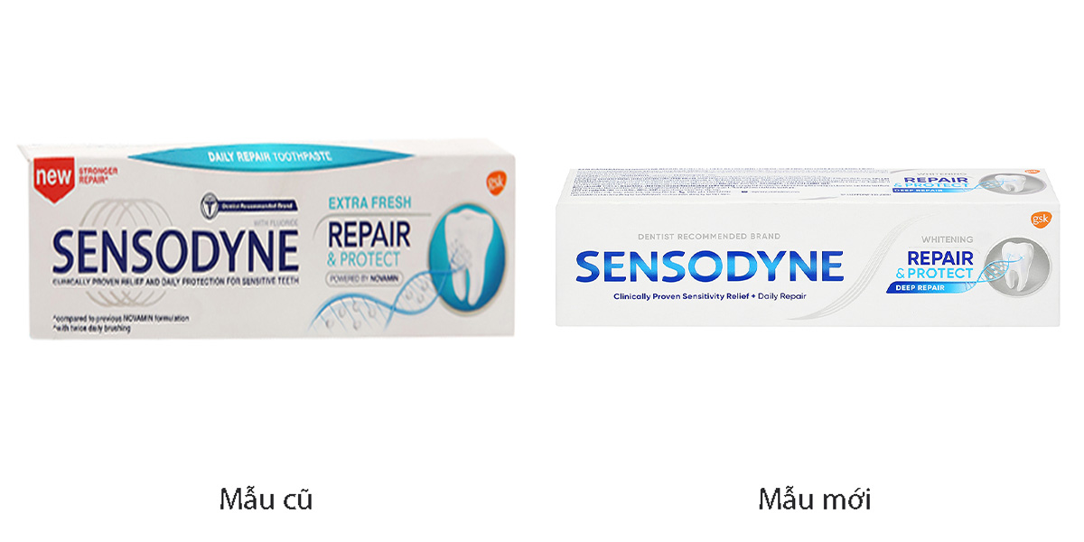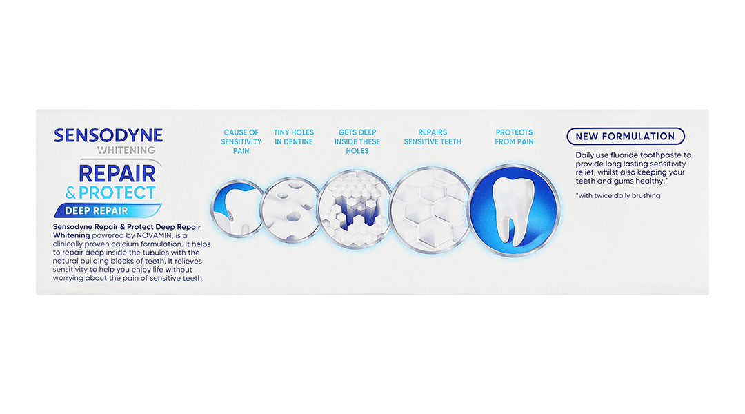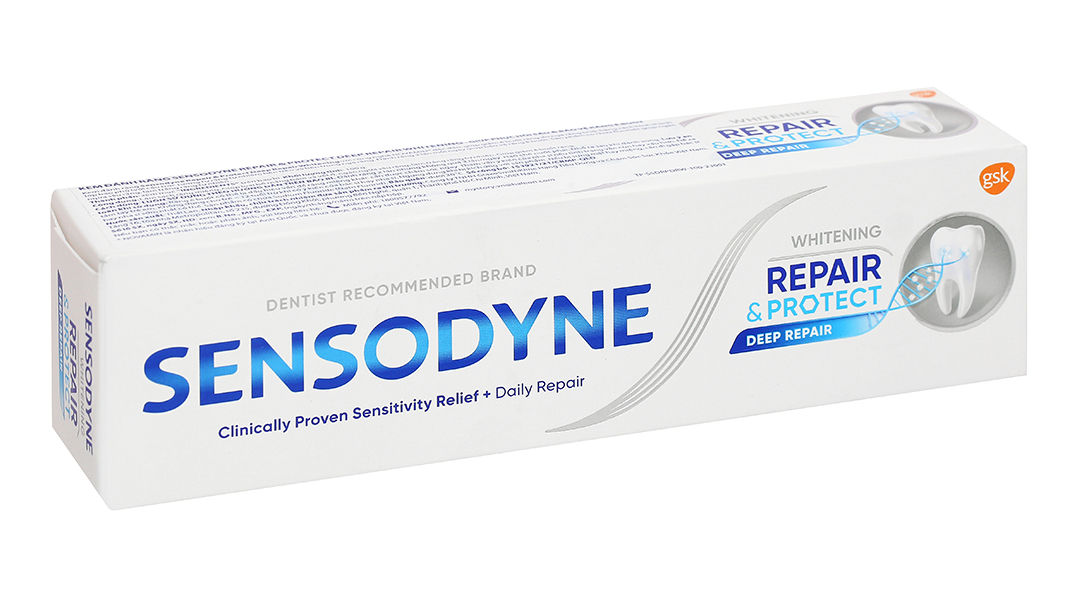 - Kem đánh răng Sensodyne Repair & Protect Deep Repair Whitening với công nghệ tiên tiến Novamin giúp phục hồi sâu cho răng ê buốt bằng cách hình thành lớp bảo vệ vững chắc với cấu trúc tương tự men răng bao phủ vùng răng nhạy cảm.