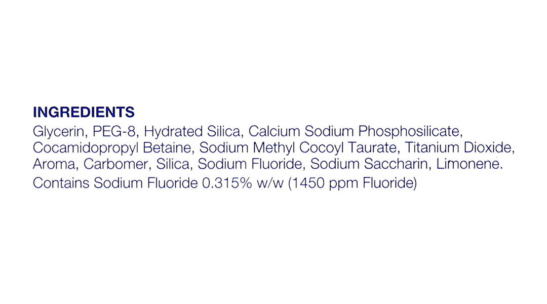 Glycerin, PEG-8, Hydrated Silica, Calcium Sodium Phosphosilicate, Cocamidopropyl Betaine, Sodium Methyl Cocoyl Taurate, Titanium Dioxide, Aroma, Carbomer, Silica, Sodium Fluoride, Sodium Saccharin, Limonene. Contains Sodium Fluoride 0.315% w/w (1450 ppm Fluoride).