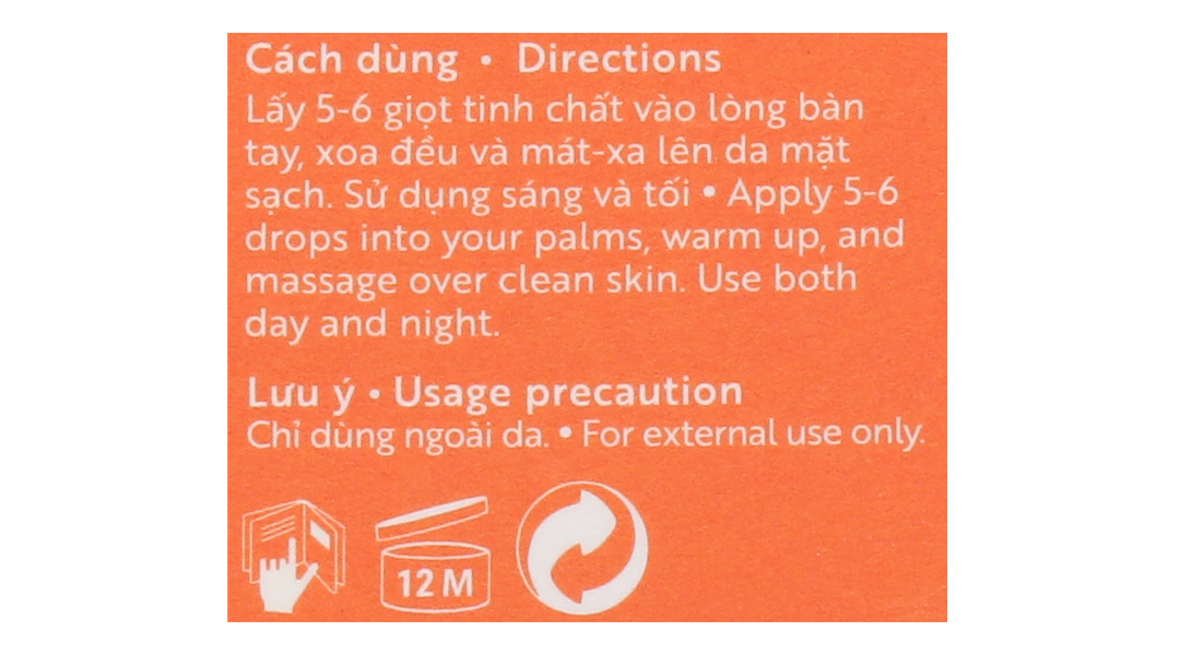 - Lấy 5-6 giọt tinh chất vào lòng bàn tay, xoa đều và mát xa lên da mặt sạch, tránh vùng mắt.