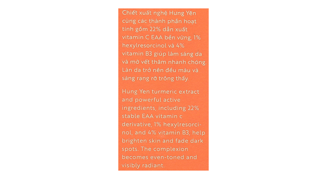 - Với chiết xuất nghệ Hưng Yên được biết đến như một loại serum dưỡng da với các thành phần hoạt tính gồm Vitamin C (3-O-Ethyl Ascorbic Acid), Vitamin B3 (Niacinamide), NAG (N-Acetyl Glucosamine) theo tỉ lệ 5 – 4 – 2 giúp làm sáng da và mờ vết thâm nhanh chóng.